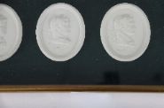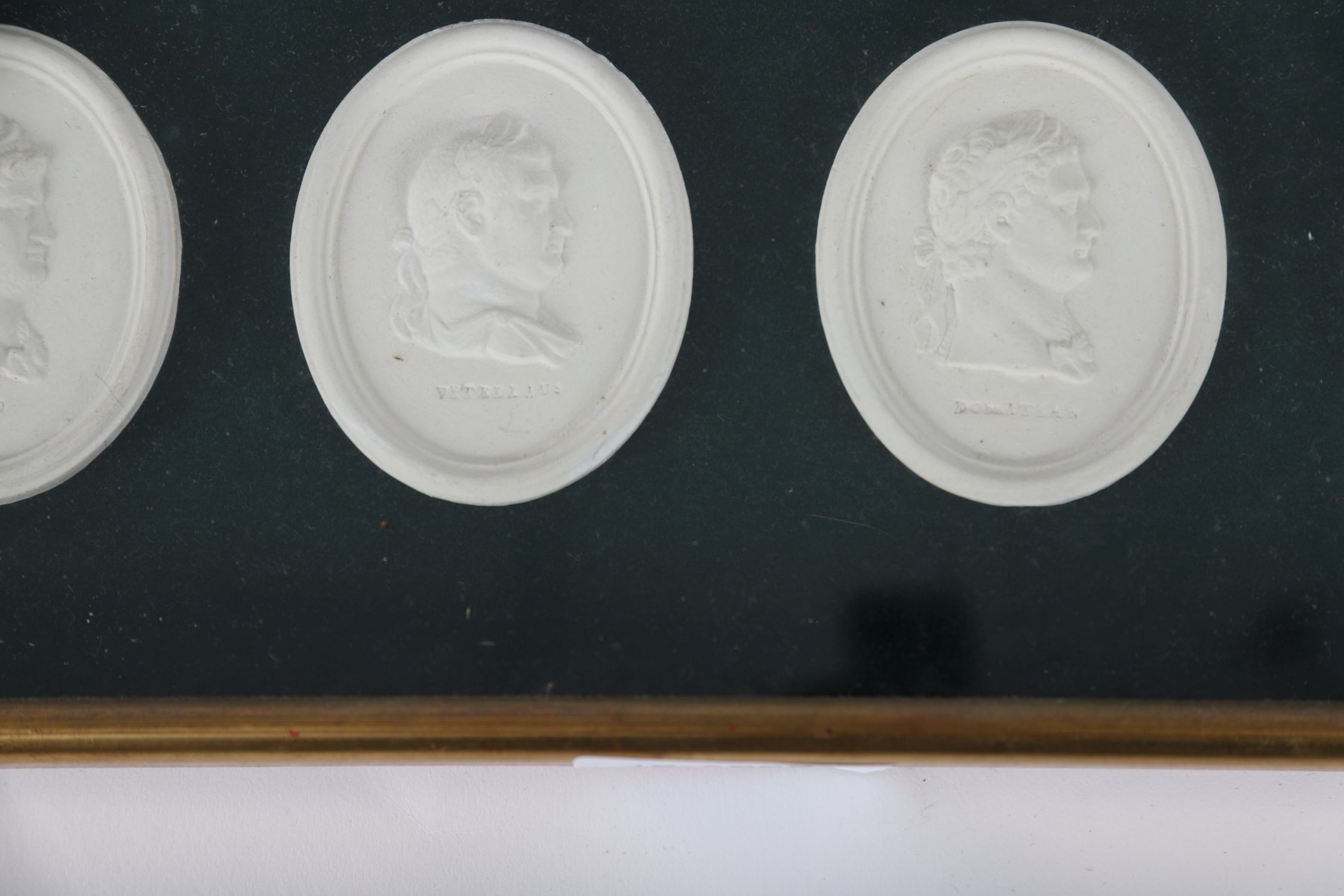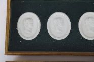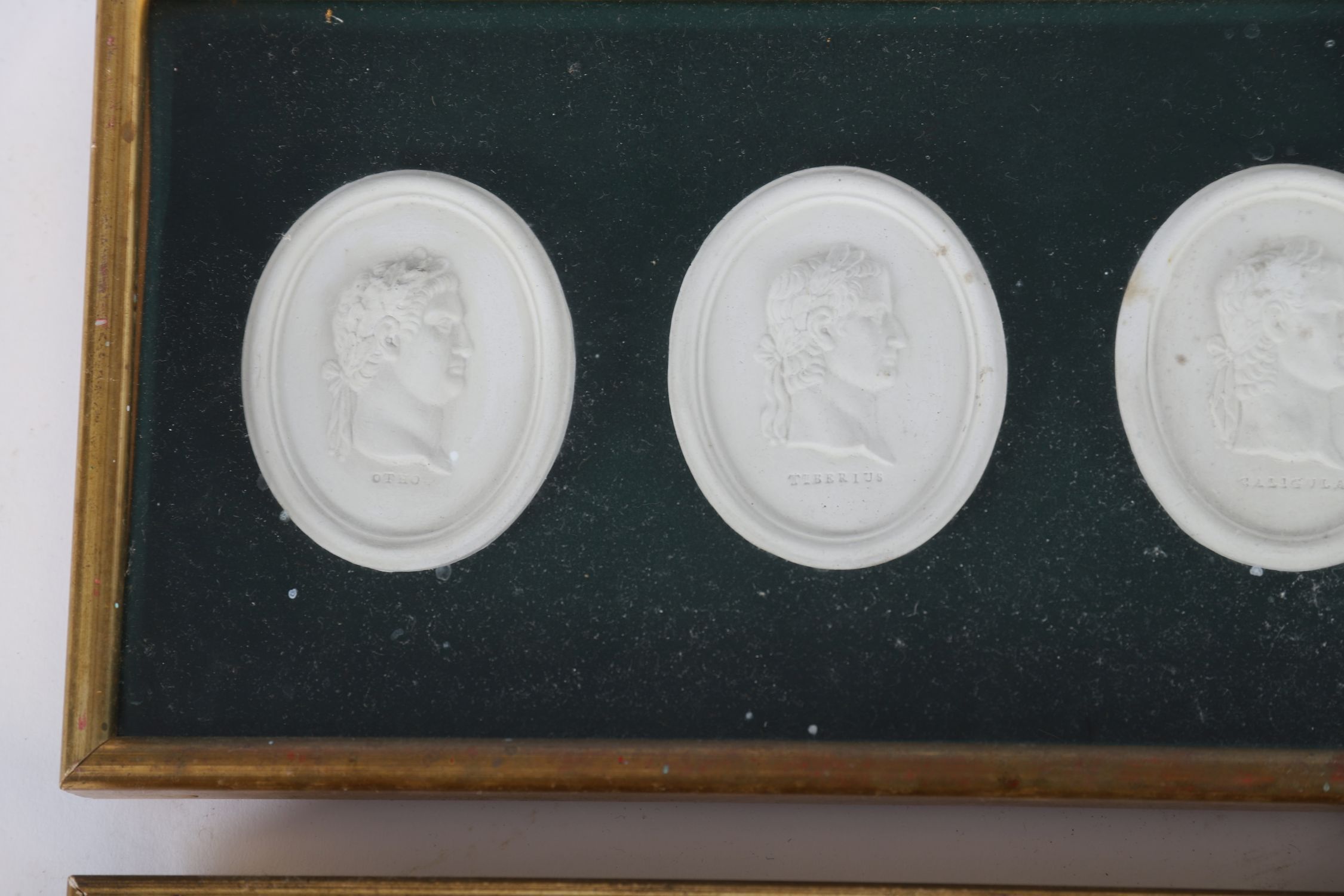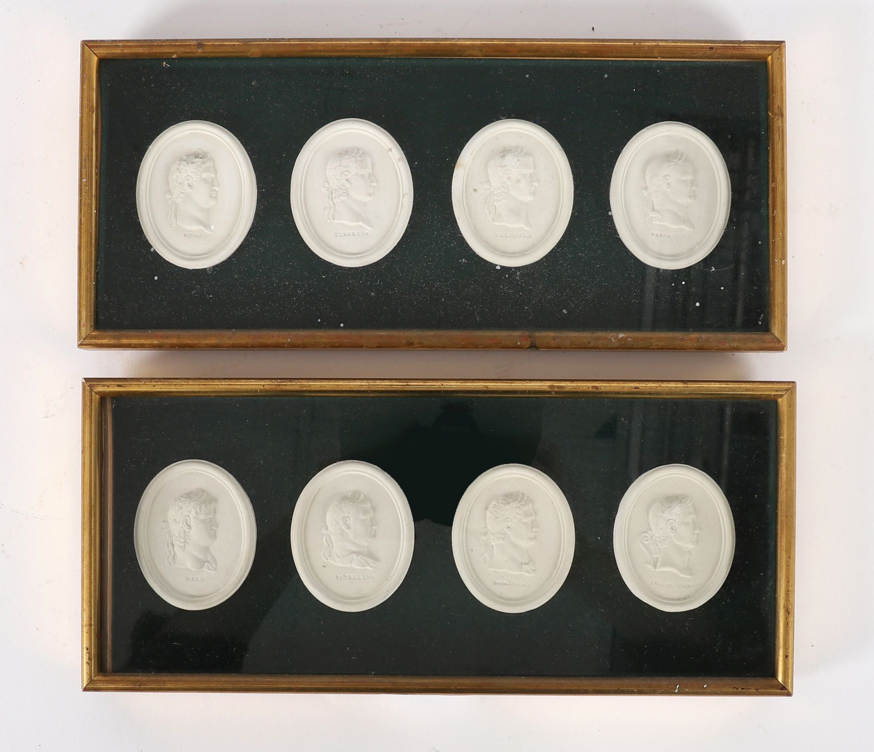 A pair of gilt-framed displays containing a total of eight plaster intaglios depicting classical portrait profiles. The medallions are set against a dark ground under glass, each bearing fine neoclassical detail.