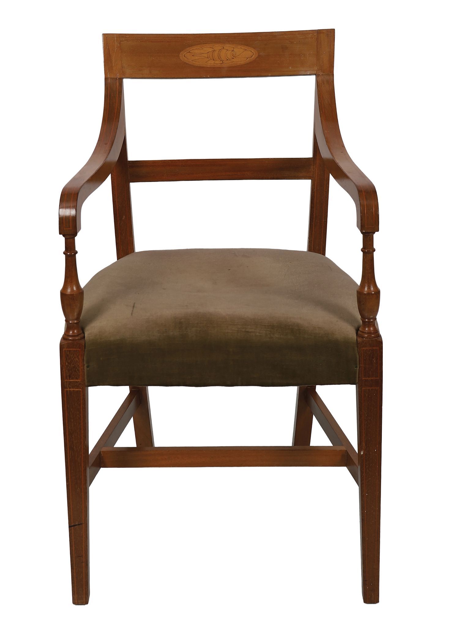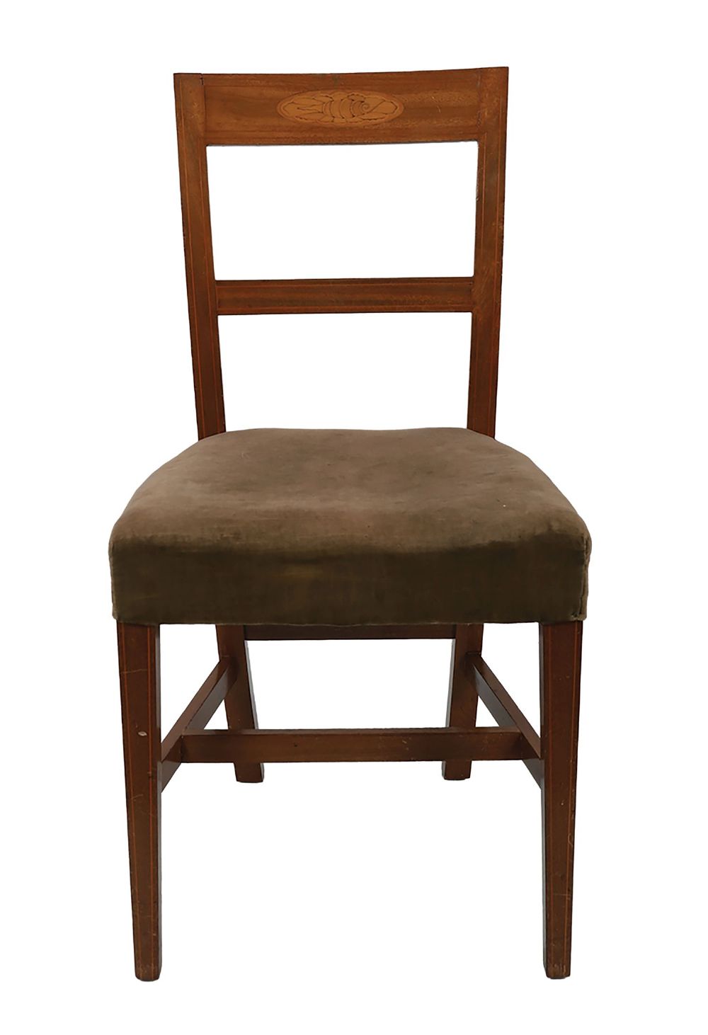 each with a curved inlaid crest rail above a stuff-over seat, raised on square tapered legs to the fore.