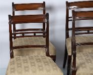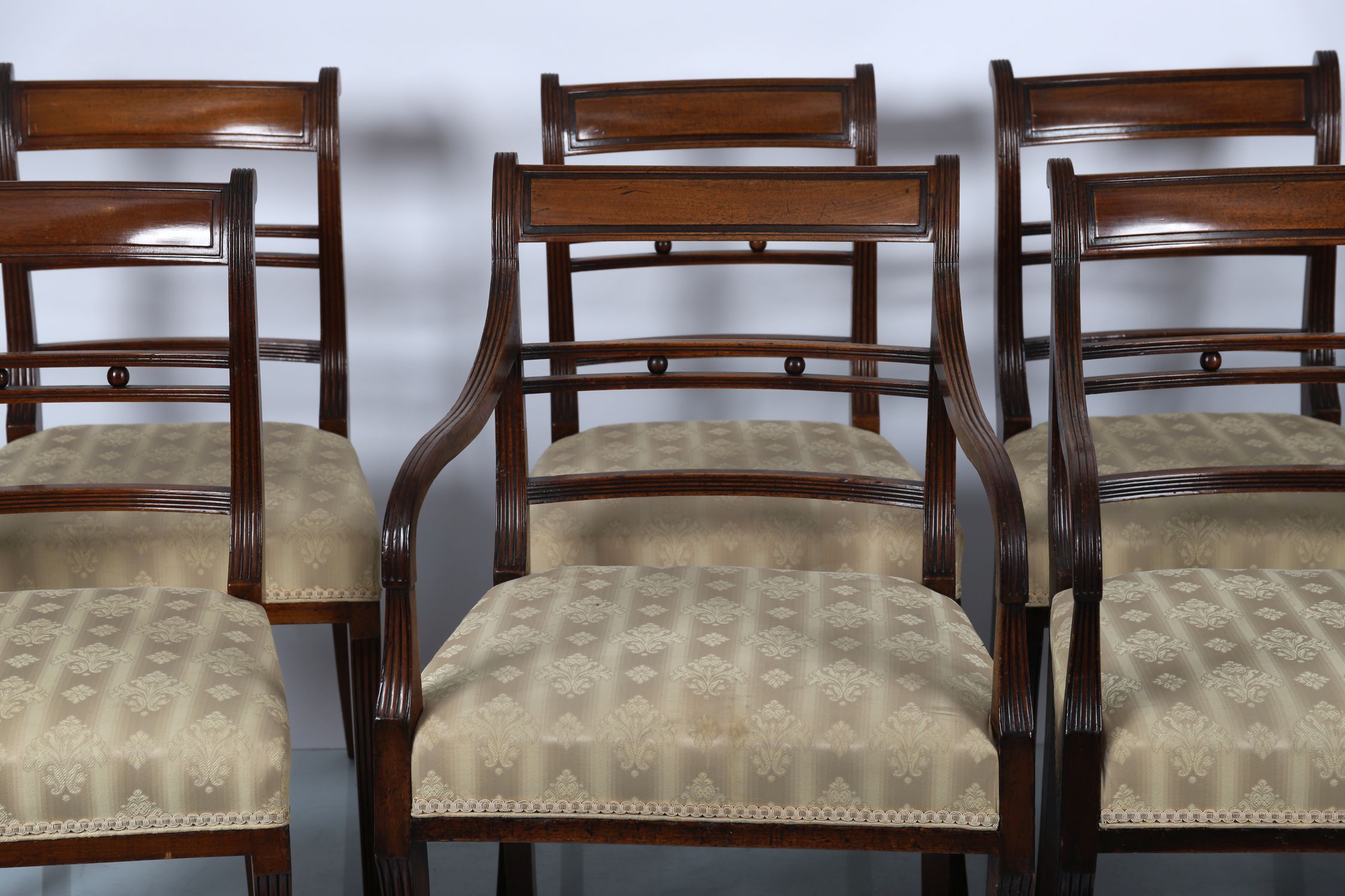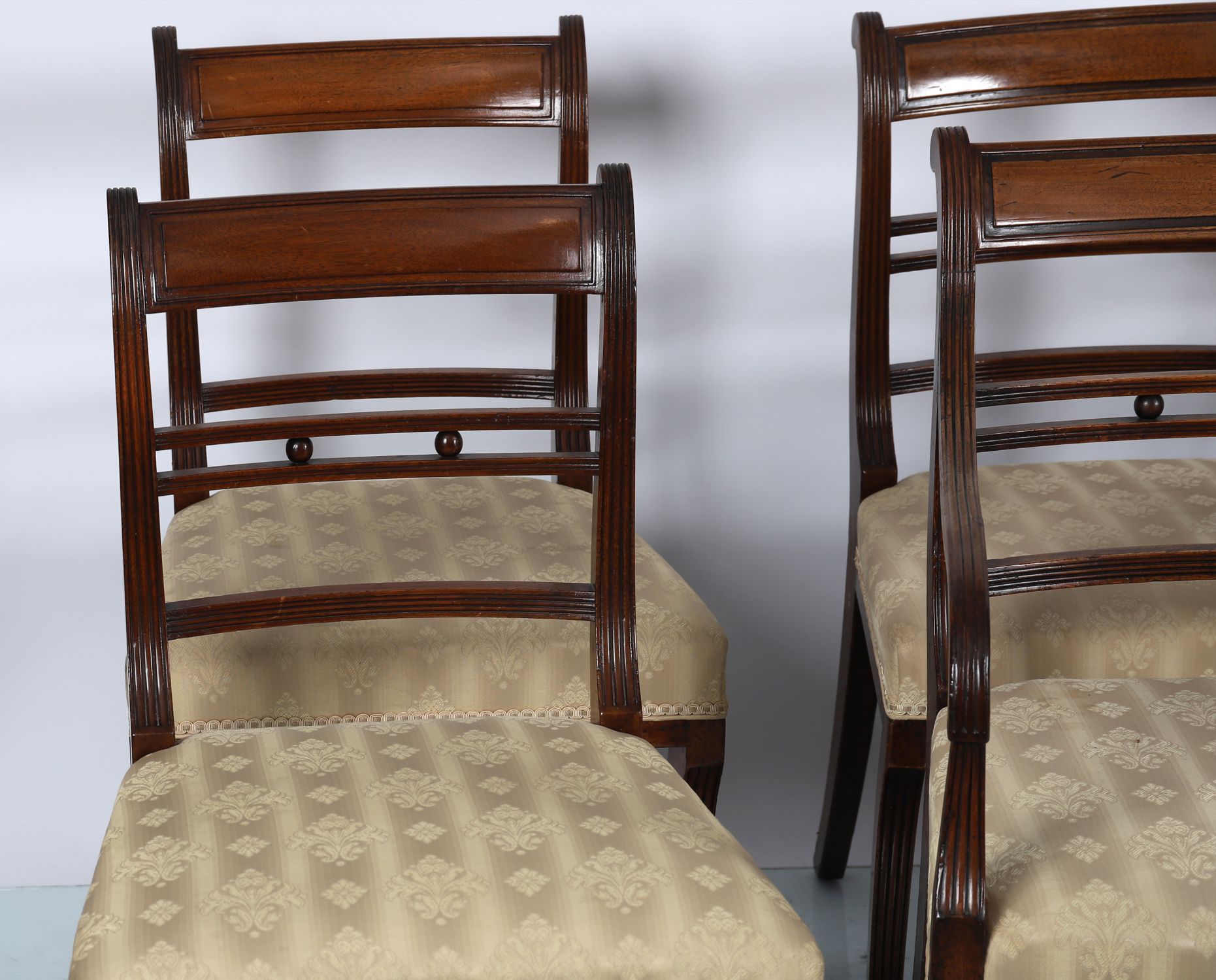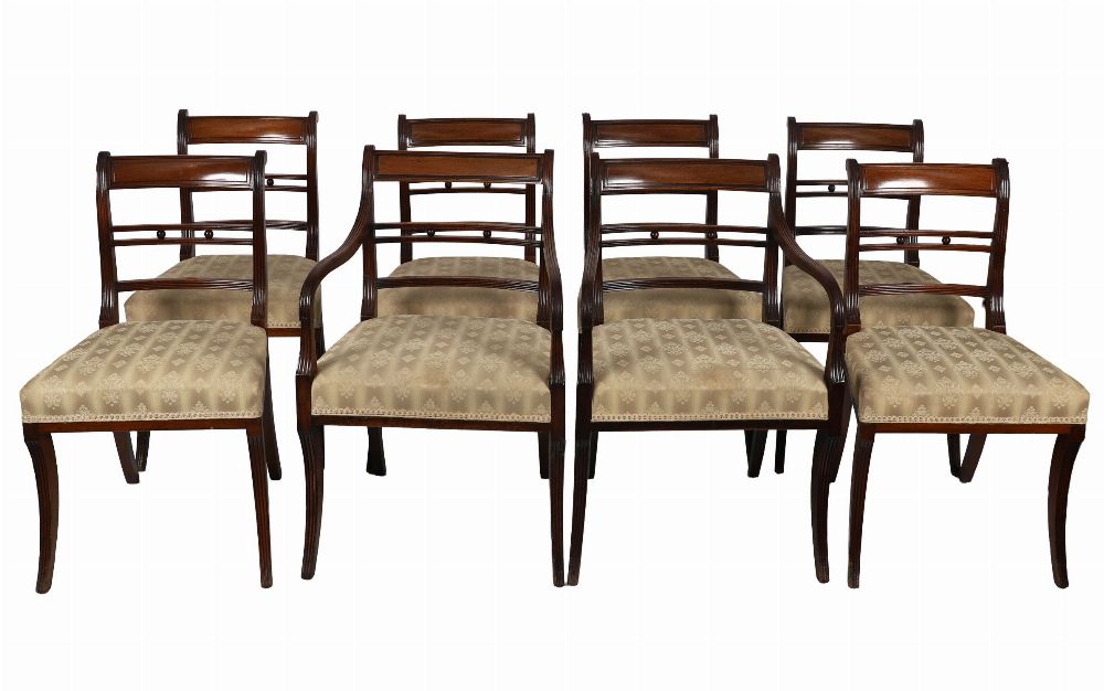 A set of eight Regency period mahogany dining chairs comprising six side chairs and two open armchairs (carvers). Each with reeded bar backs and gently curved top rails, above panelled and reeded horizontal splats and upholstered drop-in seats in a damask-patterned fabric. Raised on reeded front legs and splayed back supports.