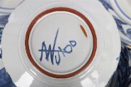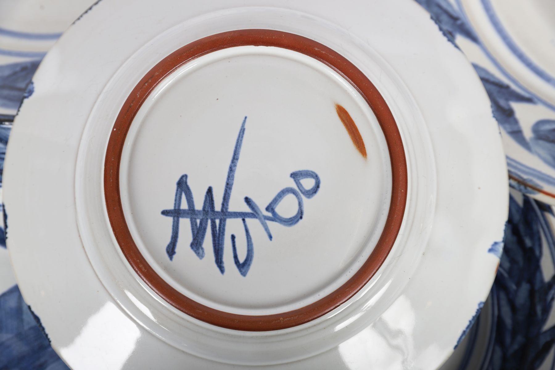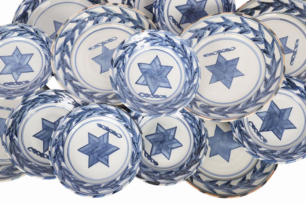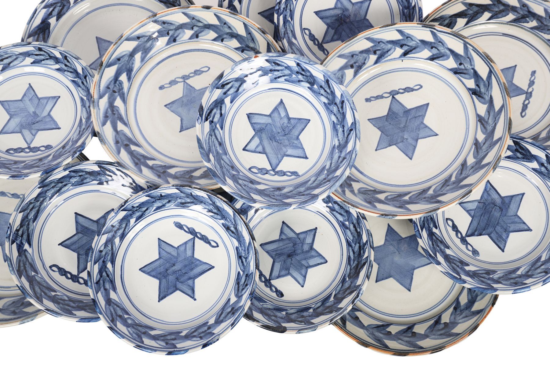 A set of hand-painted studio pottery plates by Anthony O’Brien, each decorated in blue and white with a central six-pointed star and stylised vine border. Comprises a collection of dinner and side plates.