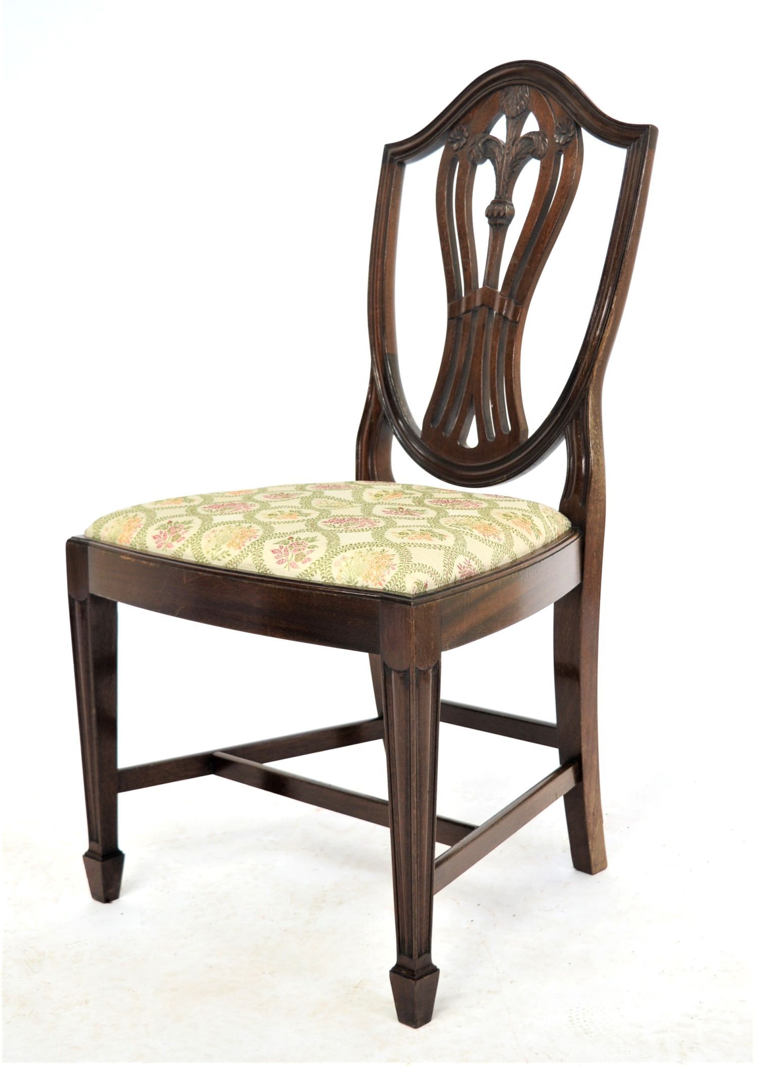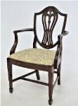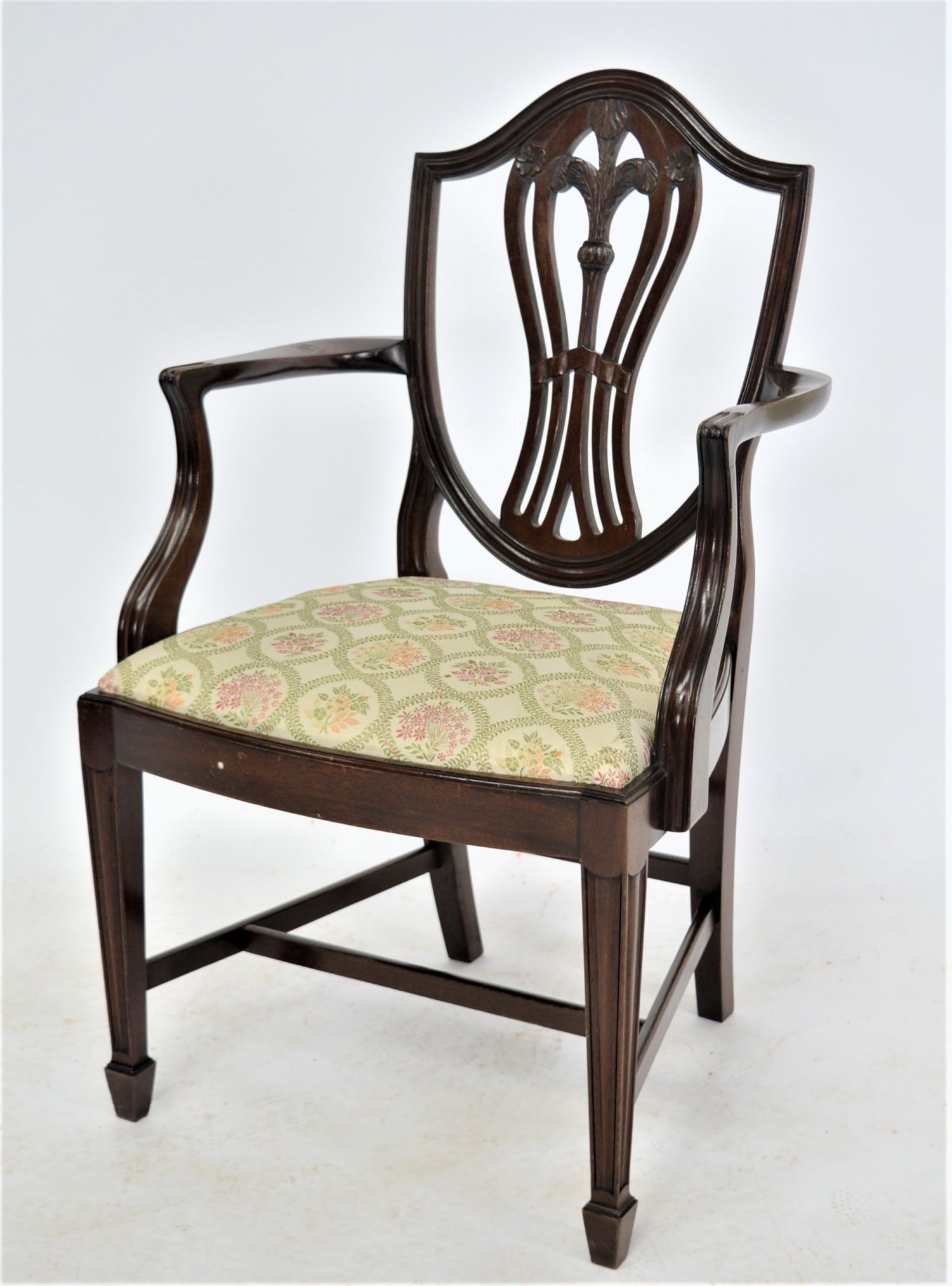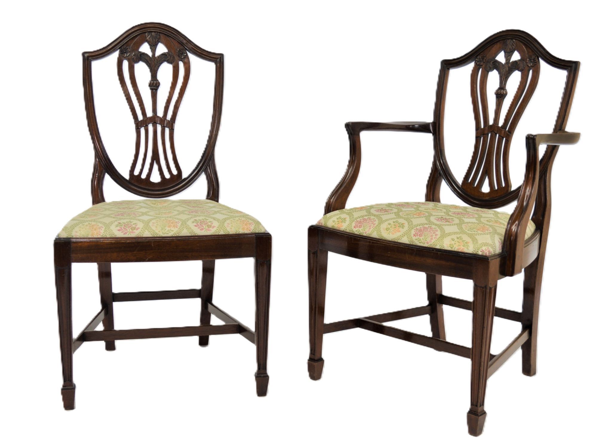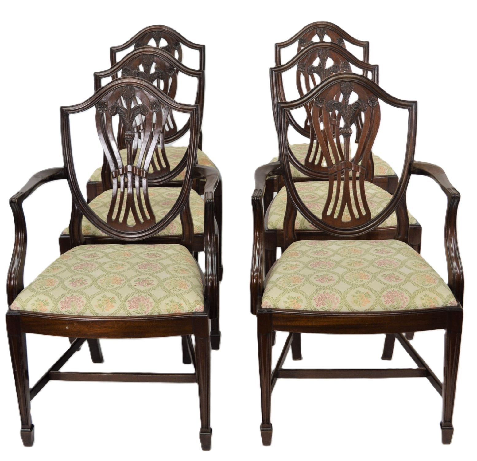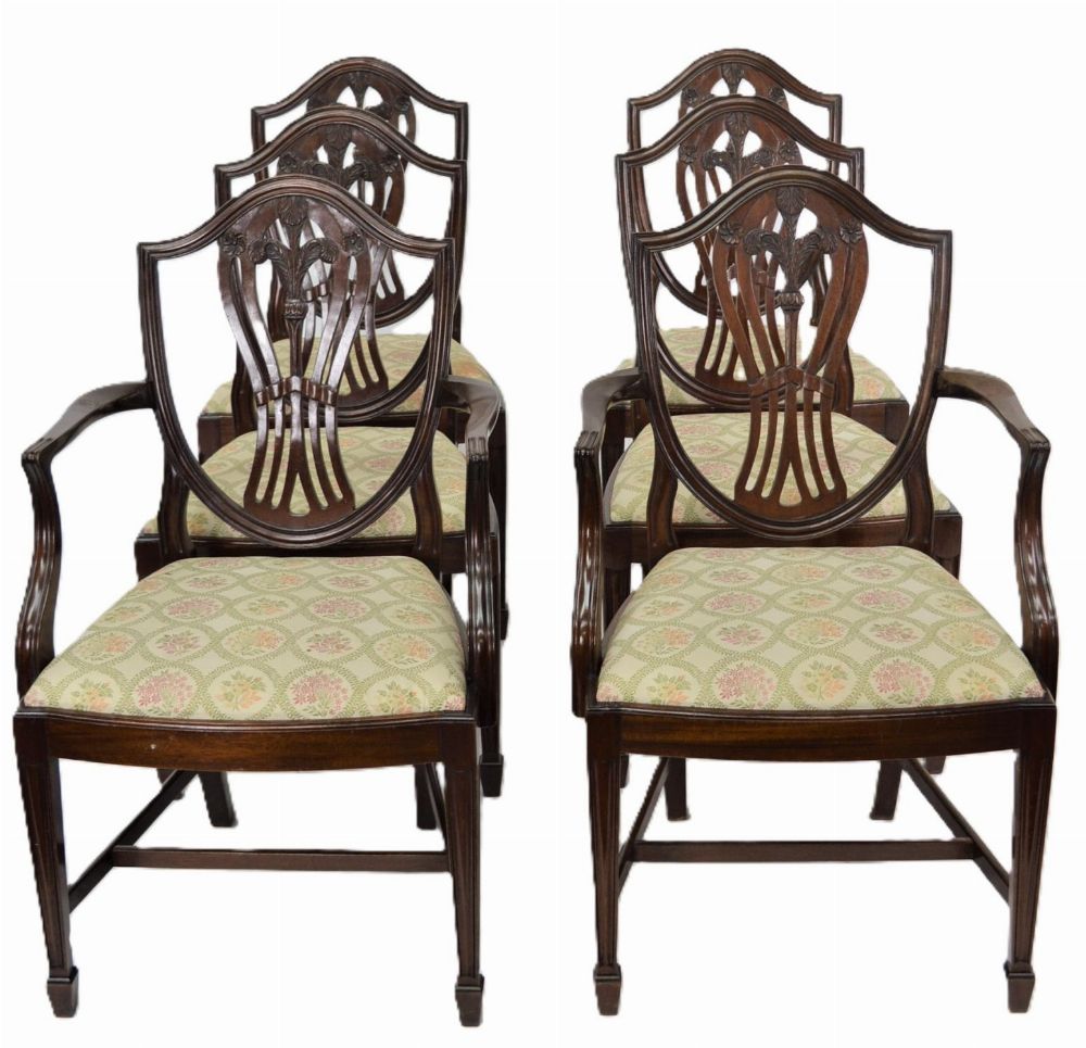 A good set of eight Hepplewhite style dining chairs, including six singles and two open armchairs. Each with shield-shaped back carved with wheat-sheaf and anthemion detail, serpentine front rails, and upholstered drop-in seats, raised on square tapered legs.