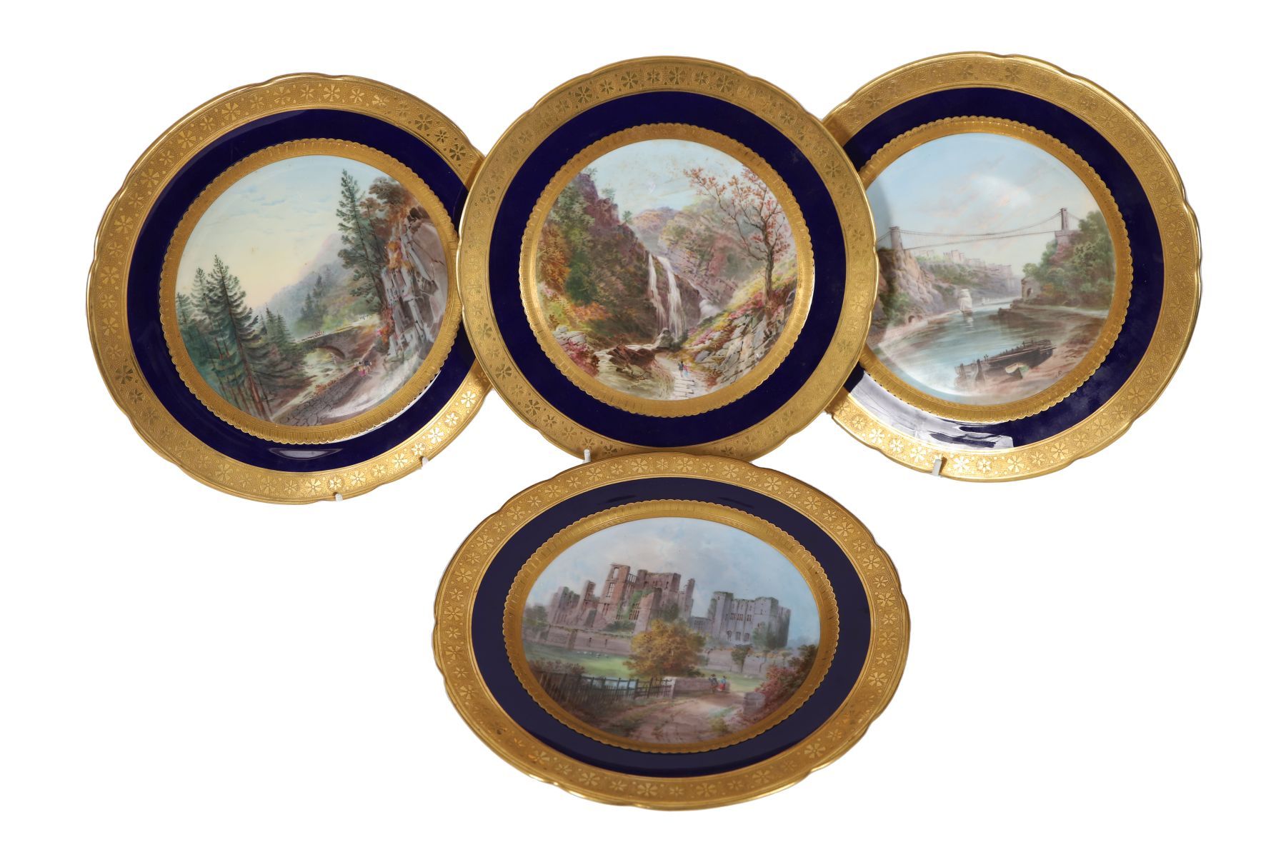 A set of four Copeland porcelain plates, each centrally painted with landscape scenes within cobalt blue borders enriched with gilt decoration, the rims finely detailed with repeating ornamental motifs.