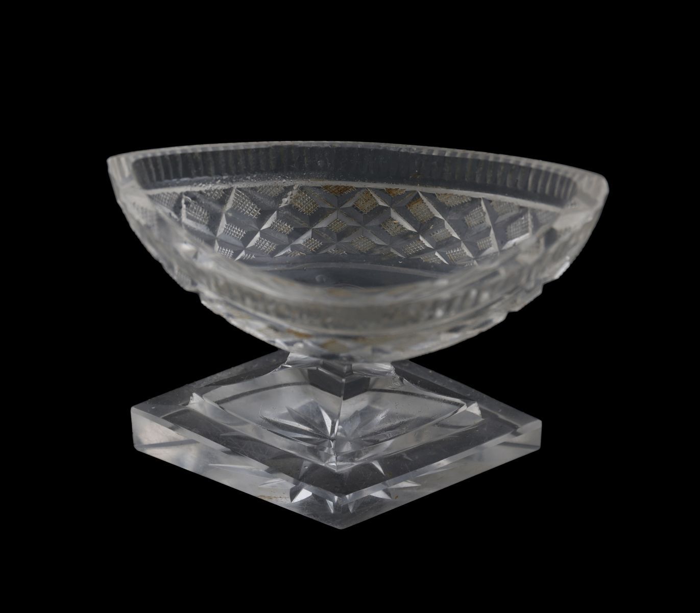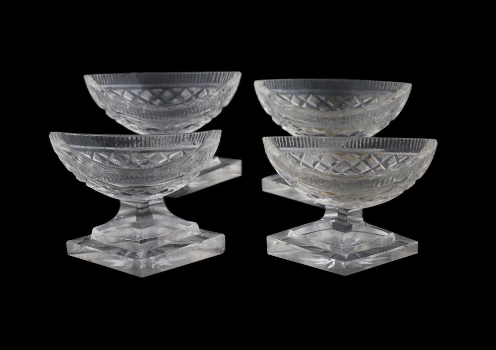 A set of four square-based cut glass salt cellars, each with diamond-cut decoration and boat-shaped bowl.