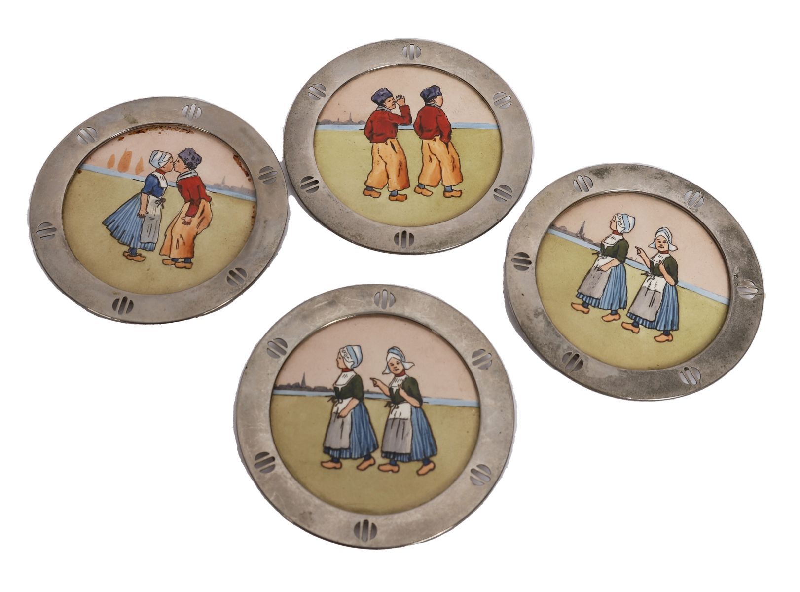 A set of four Dutch porcelain coasters, late 19th / early 20th century, each centrally painted with genre scenes of Dutch figures in regional dress, mounted within brass circular frames.