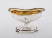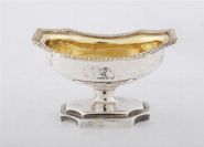 A set of four George III silver salt cellars, mark of William Abdy II, London, 1806. Each of navette form on pedestal foot with gadrooned rim and gilt interiors, engraved with a crest of an armoured arm holding a dagger.