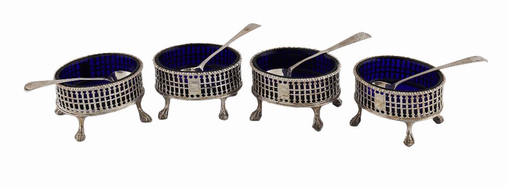 A set of four Victorian silver salts of circular pierced form, each raised on three hoof feet and fitted with a blue glass liner, bearing London hallmarks for 1873.