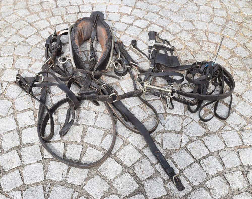 Complete set of leather and chrome-plated metal driving harness, including collar, reins, bridle, and associated fittings.