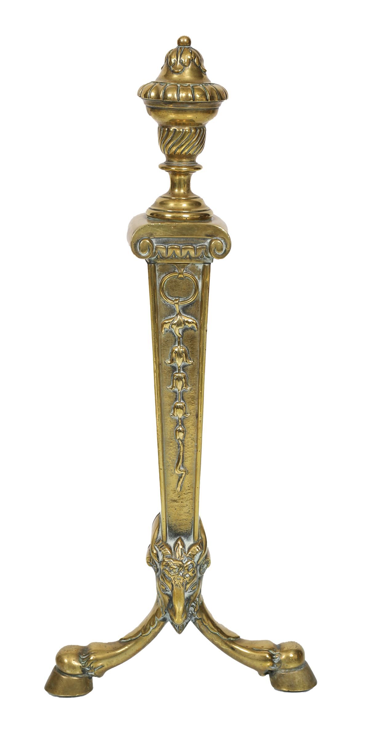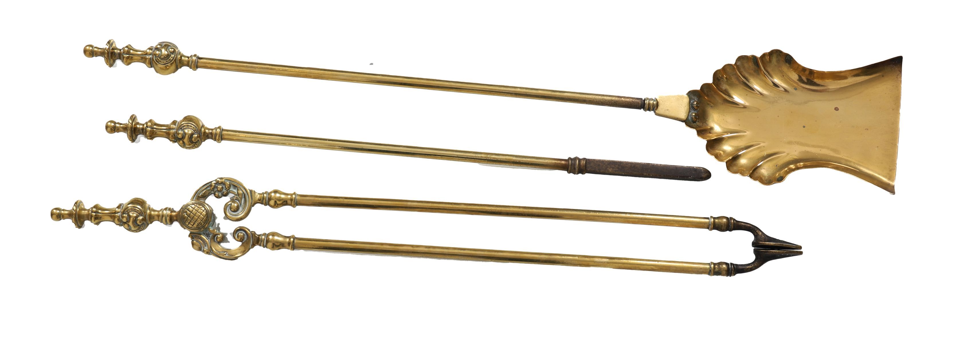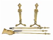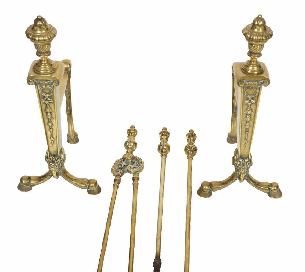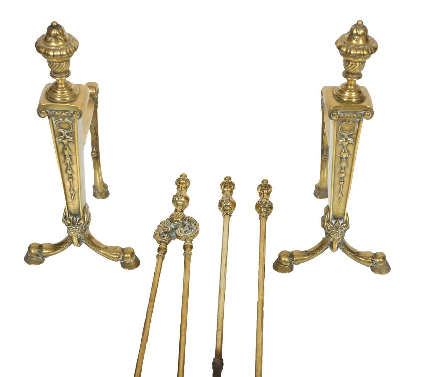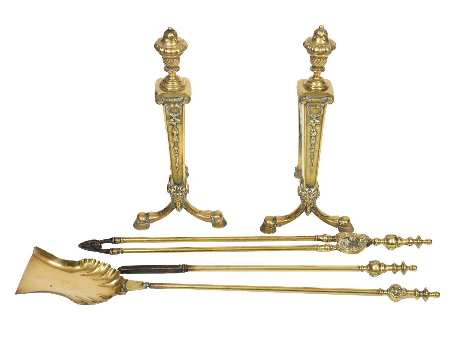 Lot 1115 SET OF NEO-CLASSICAL BRASS FIRE IRONS AND MATCHING FIRE DOGS