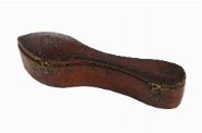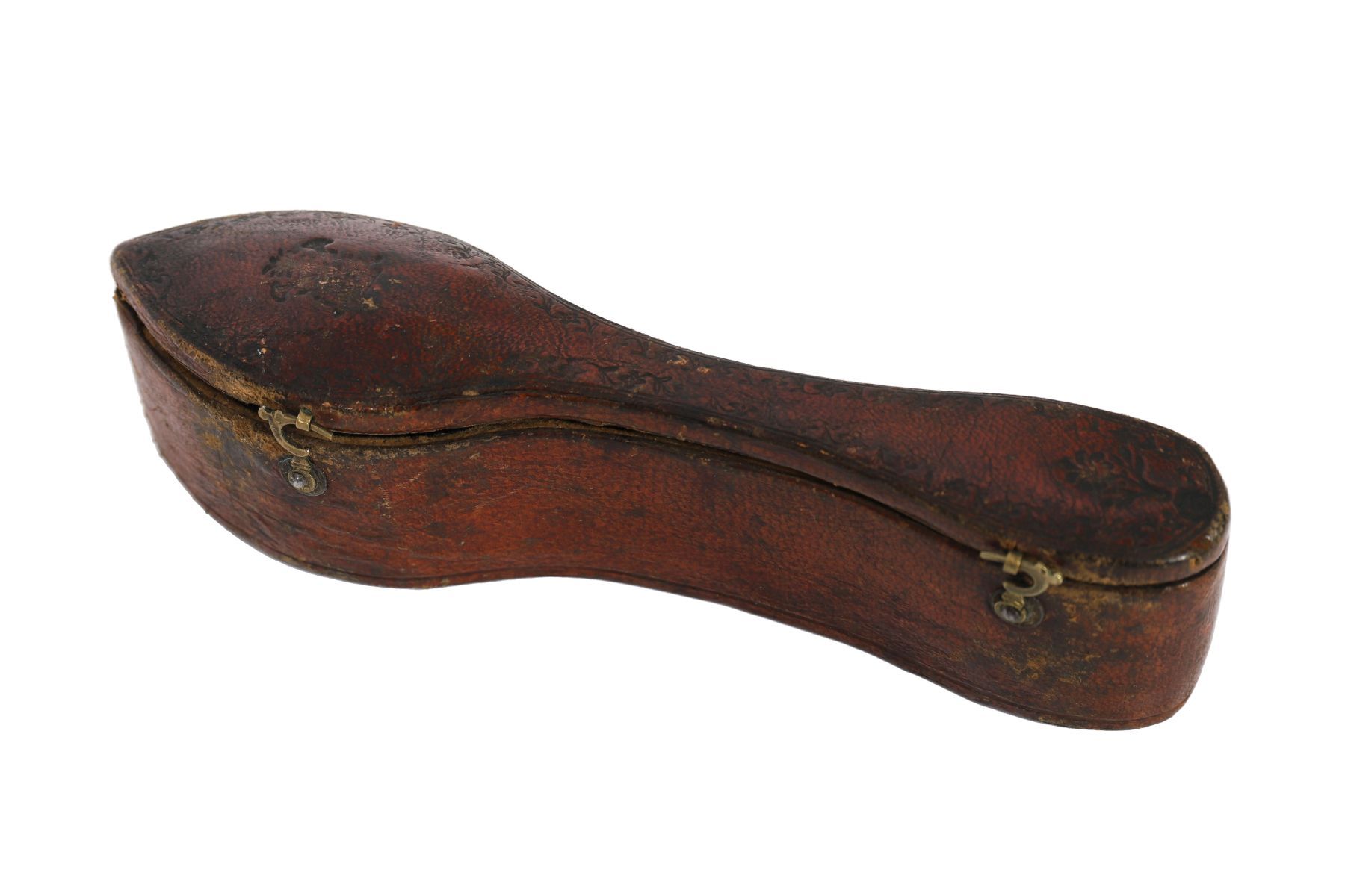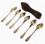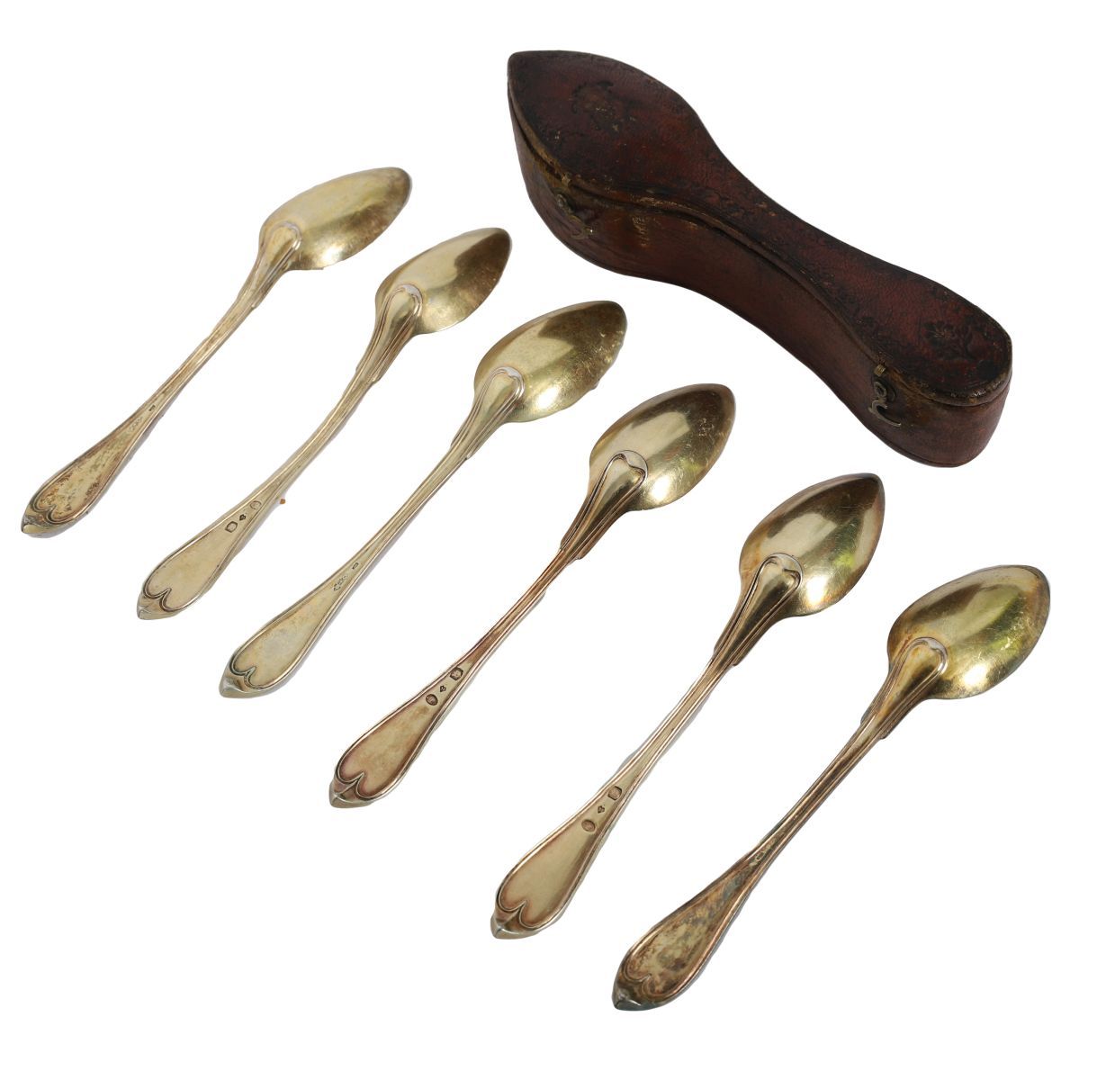 A set of six 18th-century French silver teaspoons, each with shaped bowl and stem, contained within a fitted leather spoon-shaped case.