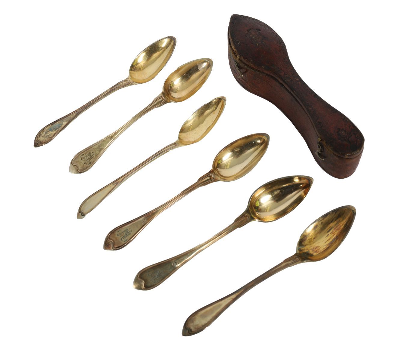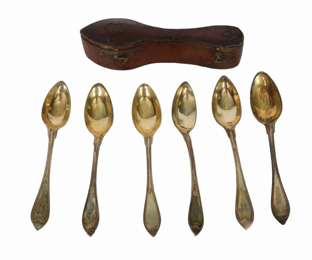 Lot 12 SET OF SIX 18TH-CENTURY FRENCH SILVER TEASPOONS IN LEATHER CASE