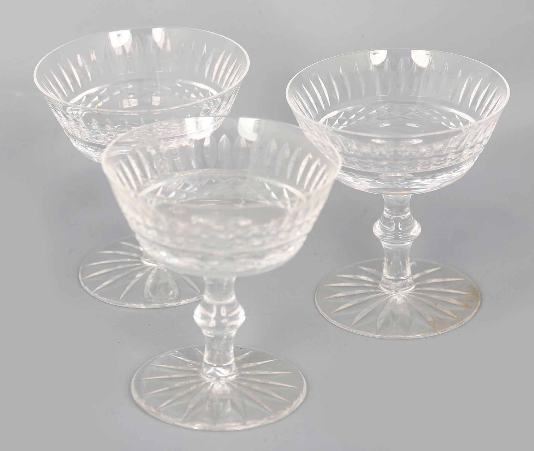 A set of six Waterford crystal champagne coupes, each with fluted and diamond-cut decoration to the bowl, raised on a faceted stem and star-cut foot.