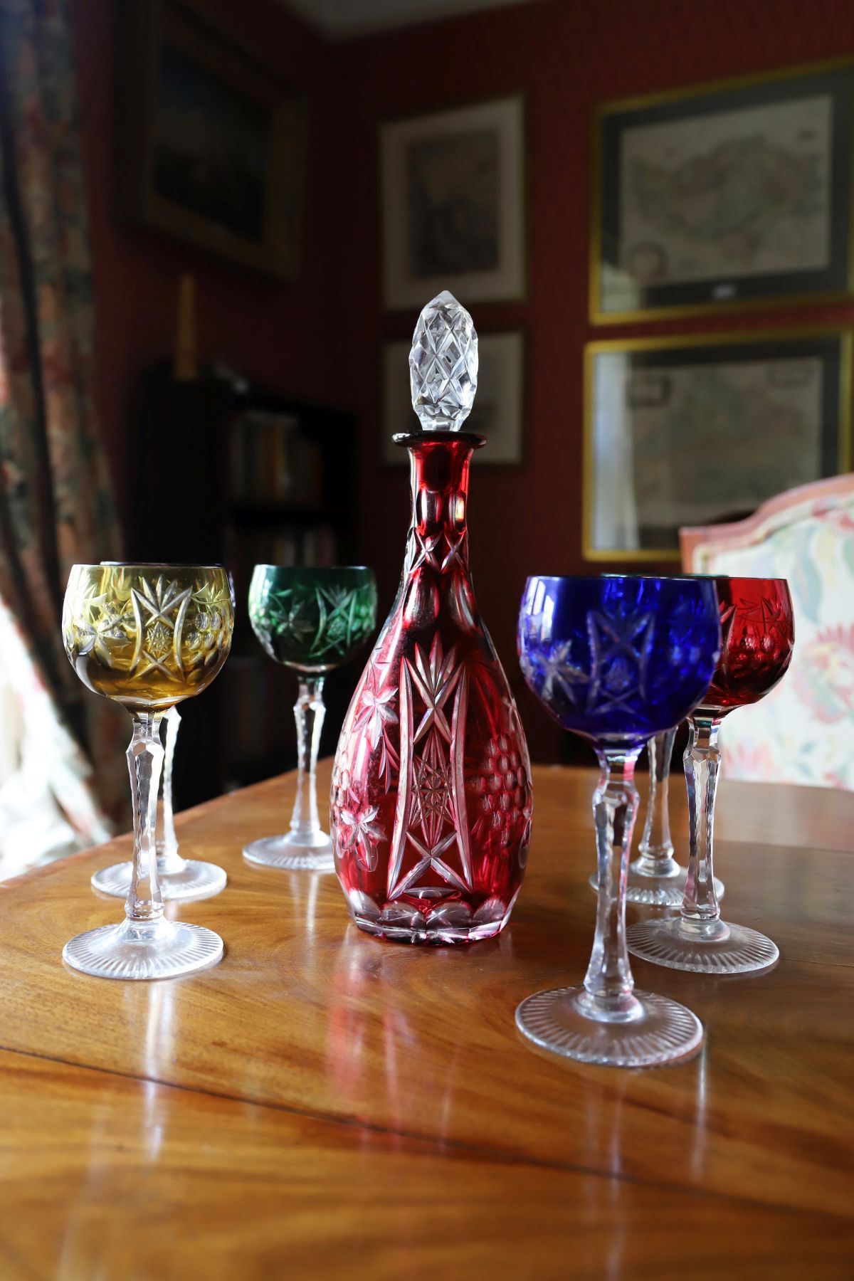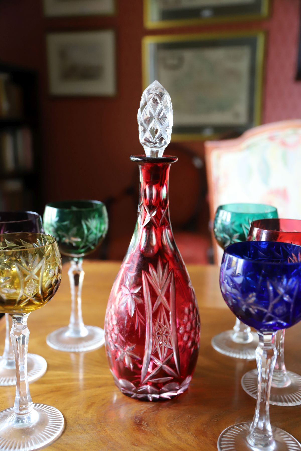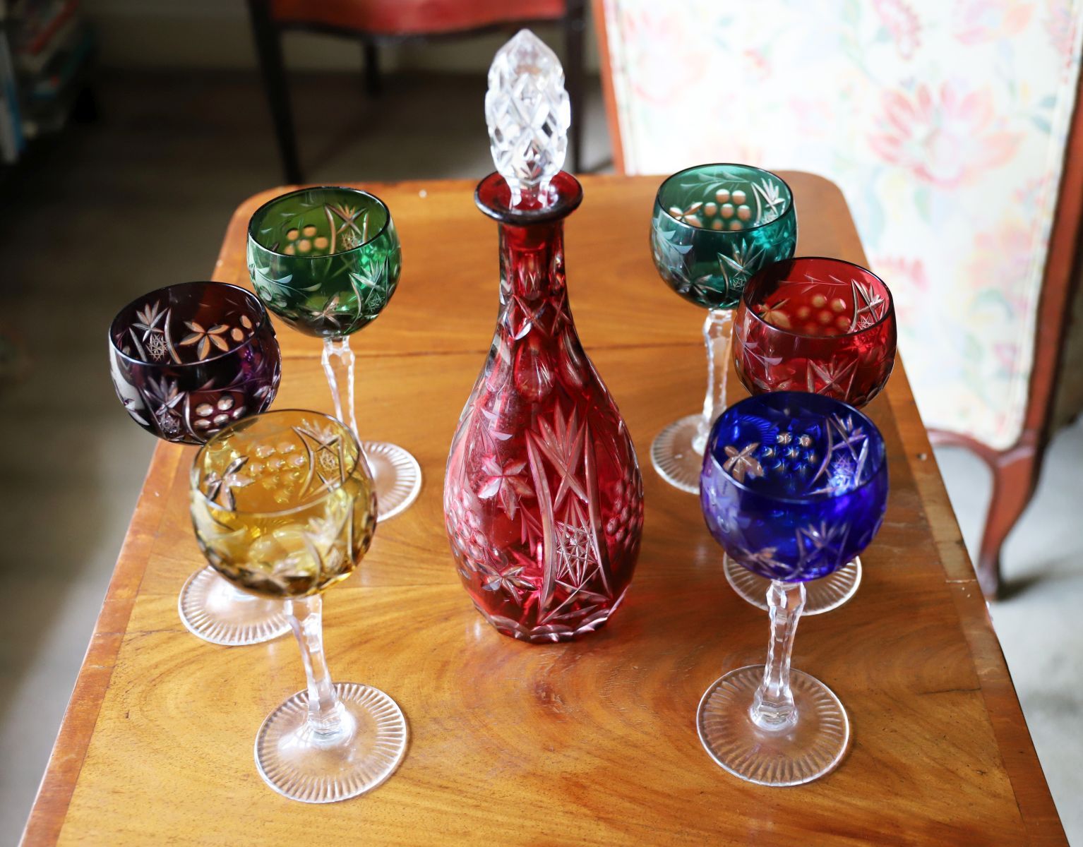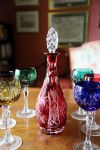A set of six cut crystal wine goblets, each with faceted bowl and stem, together with a matching cut crystal decanter and stopper.