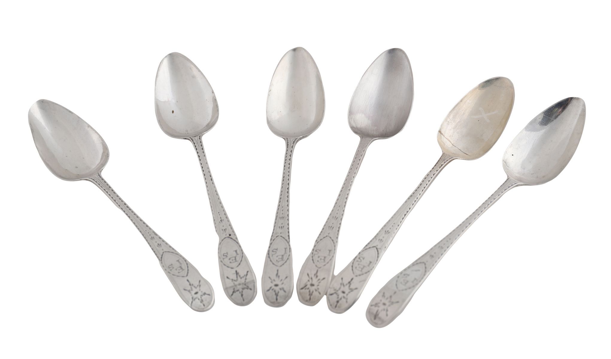 A set of six Georgian Irish silver bright-cut teaspoons, engraved terminals, maker John Shields, Dublin, circa 1790. 90 grams.