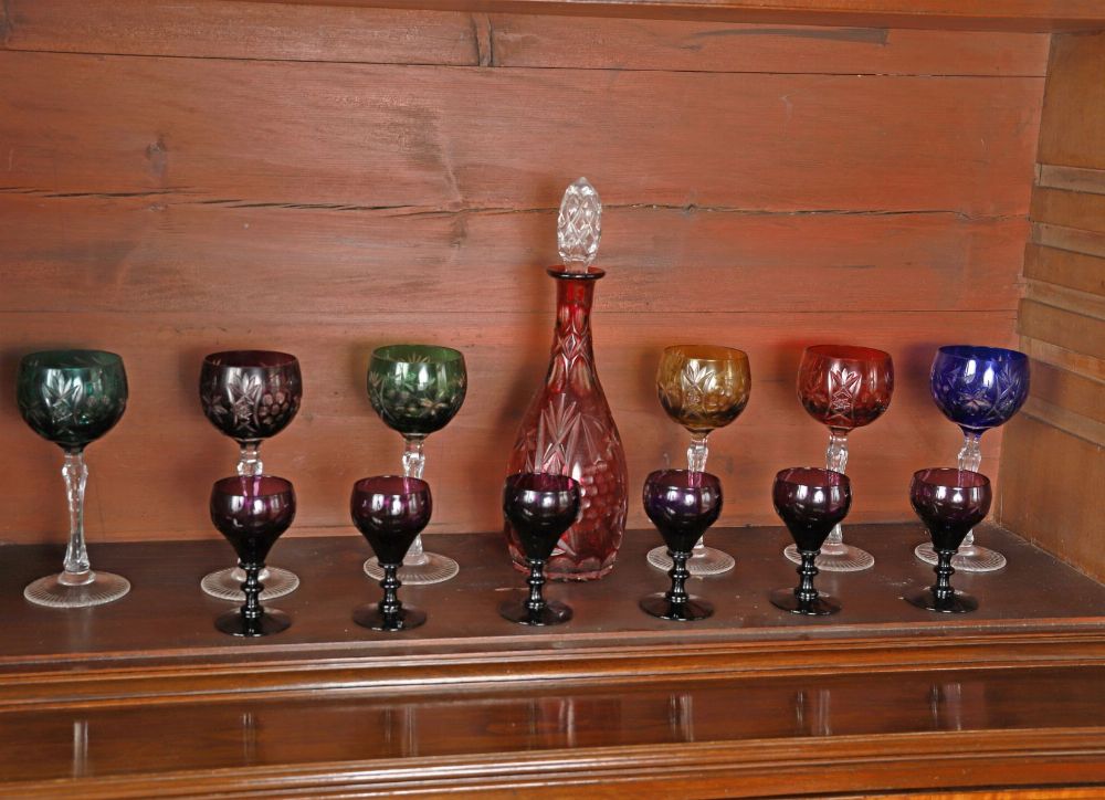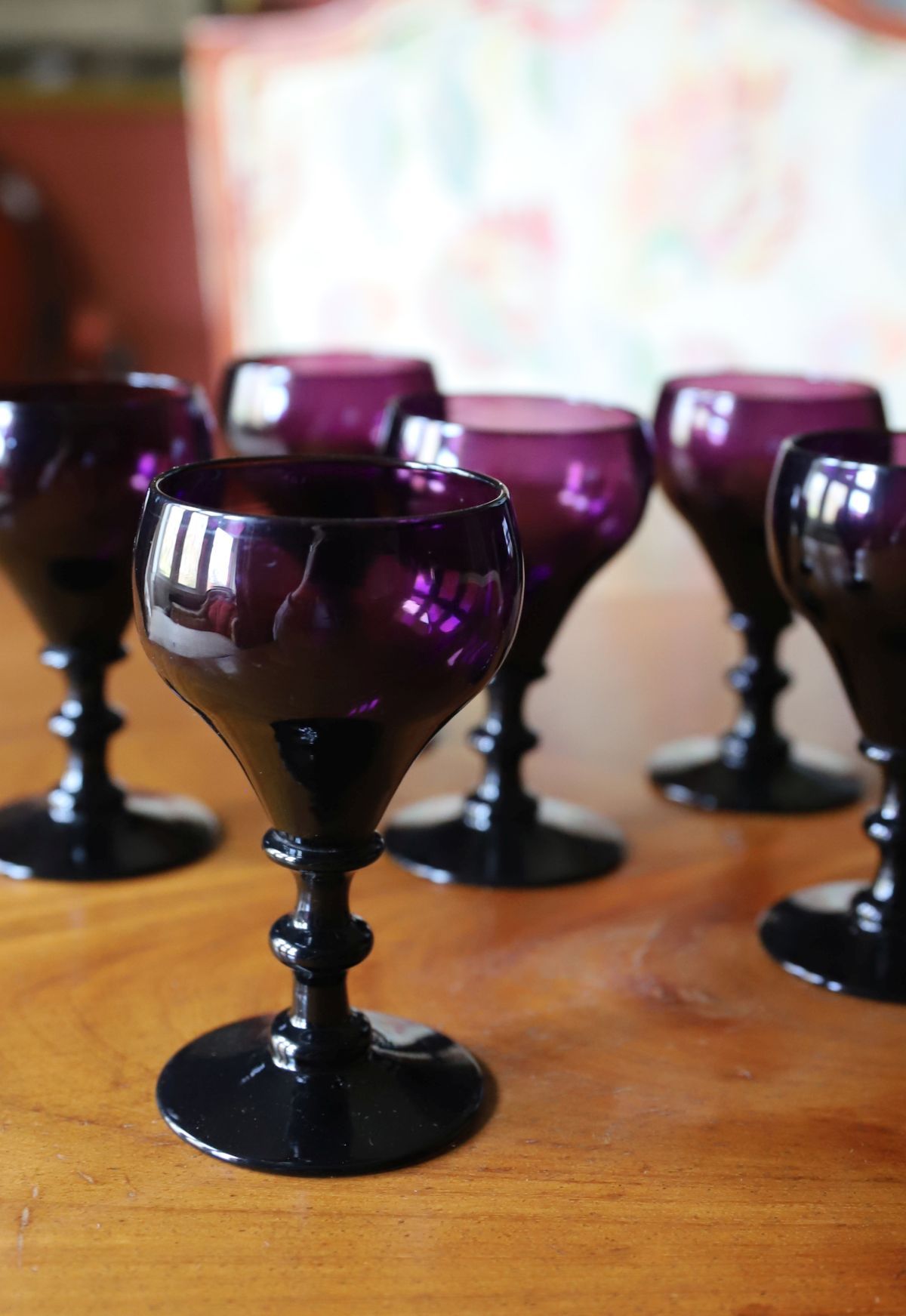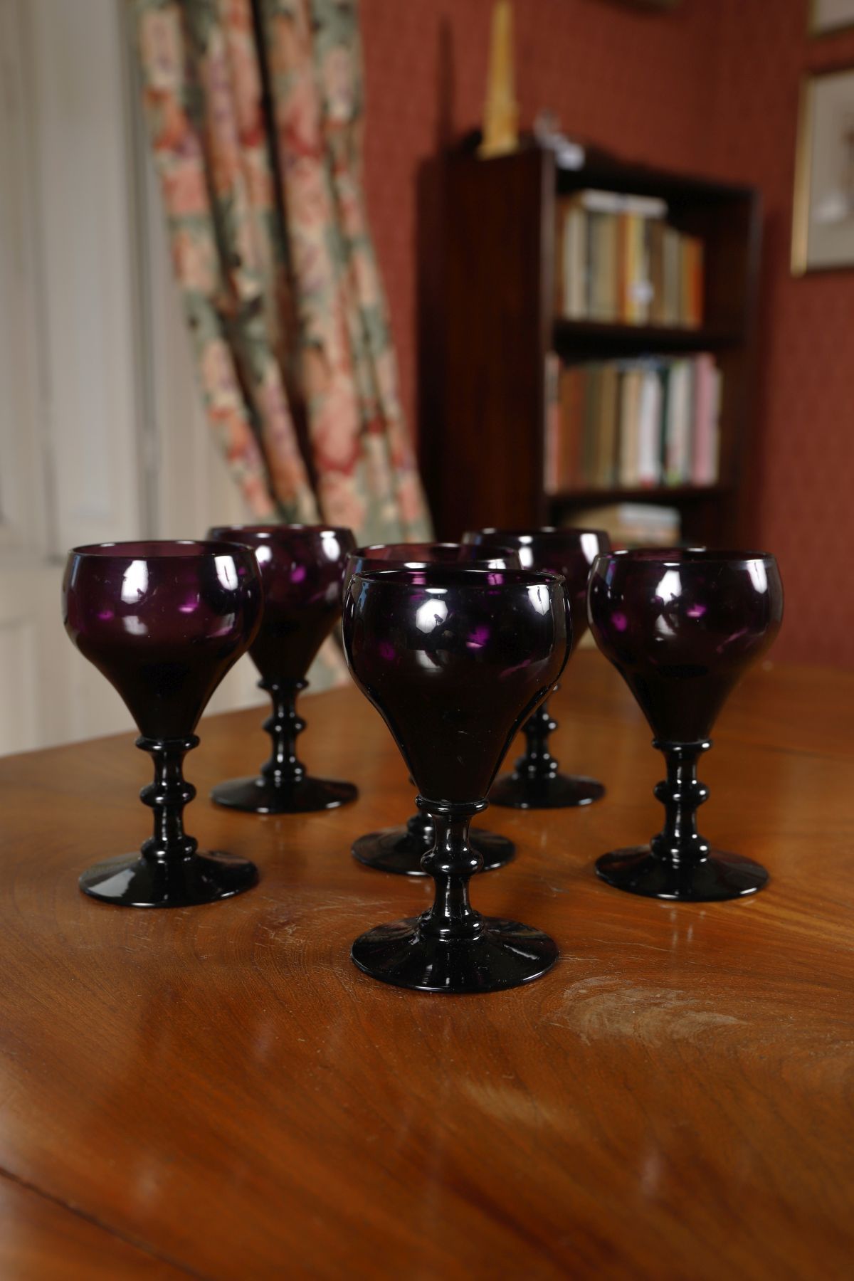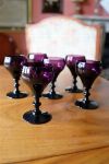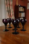 A set of six ruby-coloured glass liqueur glasses, each with deep bowl and short stem.