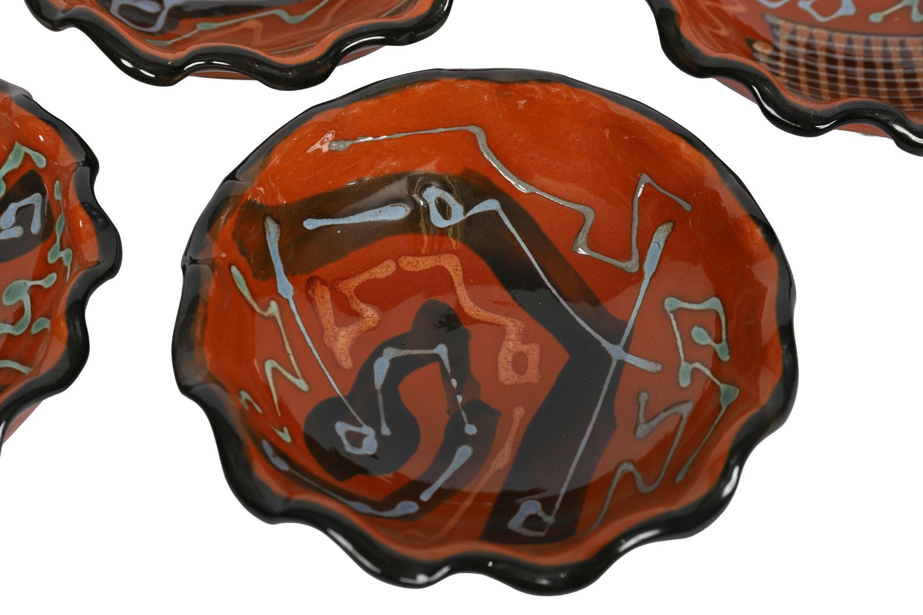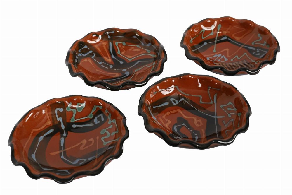 A set of four studio pottery bowls with free-form abstract decoration in slip-trailed glazes of blue, green, and black on terracotta ground, each with undulating rim and impressed or incised signature.