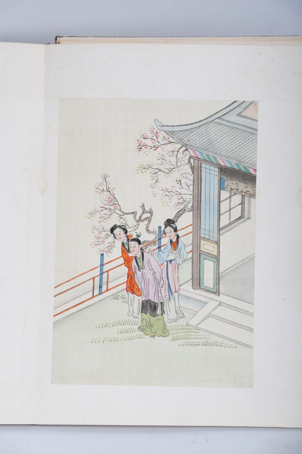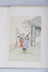A set of ten finely executed Chinese watercolour paintings on pith paper, each depicting courtly and domestic scenes with elegantly dressed figures in garden and interior settings. The works are rendered in delicate pastel tones typical of late Qing artistry, with particular attention to architectural details, foliage, and attire. Presented together within a patterned silk-bound album of traditional hexagonal motif.