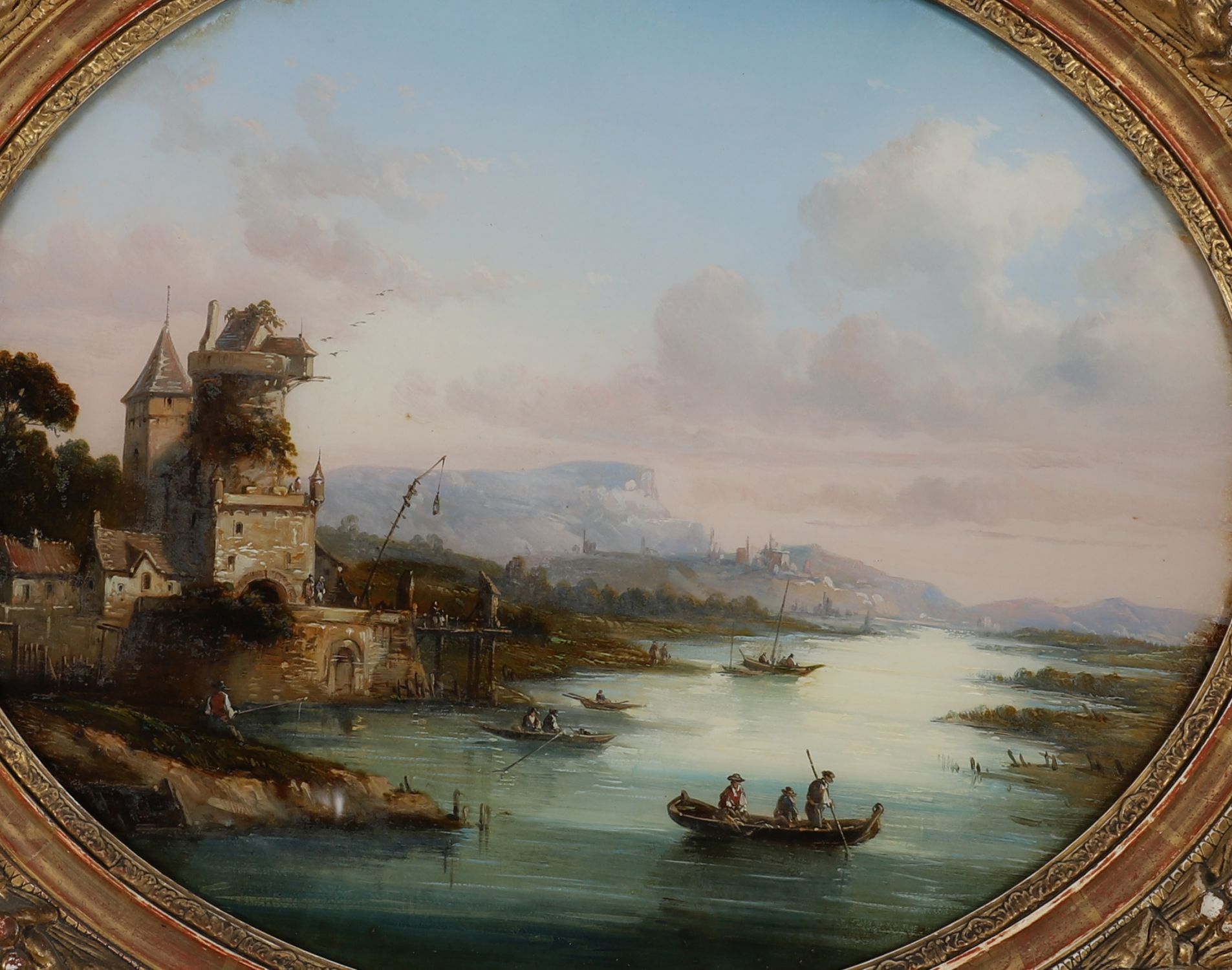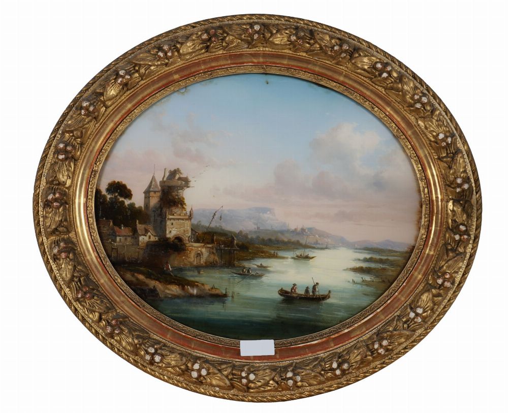 A fine and decorative set of three 19th-century continental reverse paintings on convex glass, each oval and individually framed in ornate giltwood surrounds. The scenes depict romanticised architectural and equestrian subjects: two showing figures on horseback in rustic European settings, and one with a river landscape and distant mountains, populated with boats and castle structures. All rendered in delicate detail with soft palettes and atmospheric depth, in the verre églomisé technique.