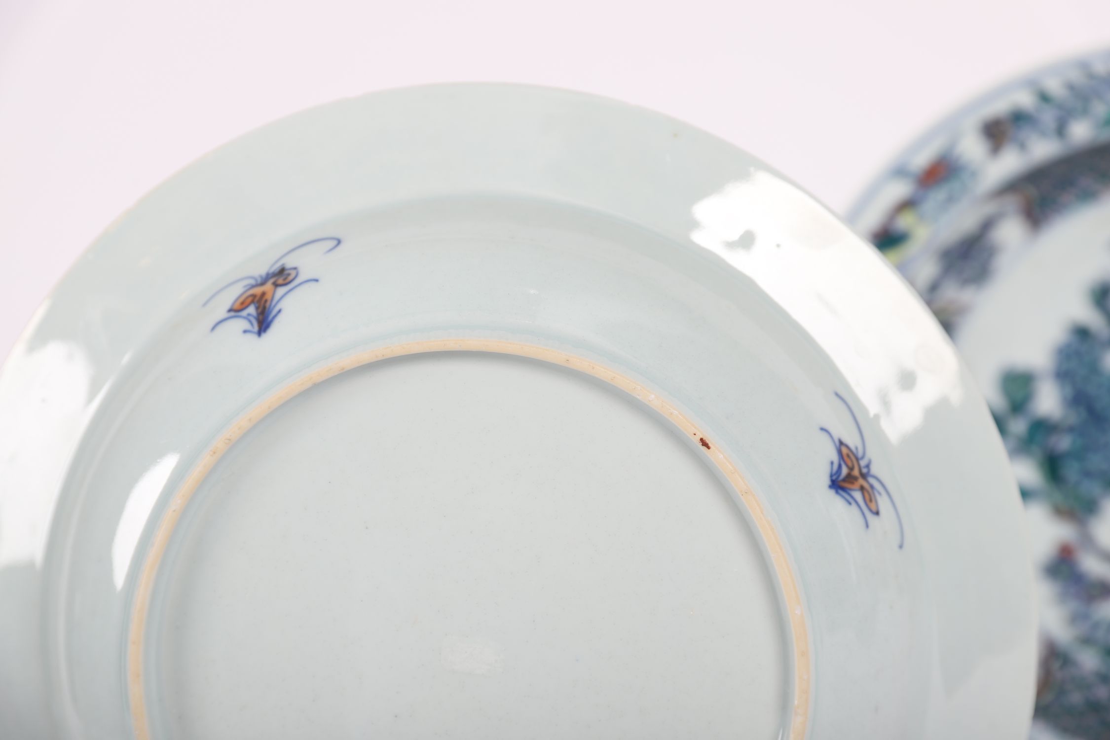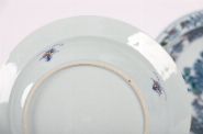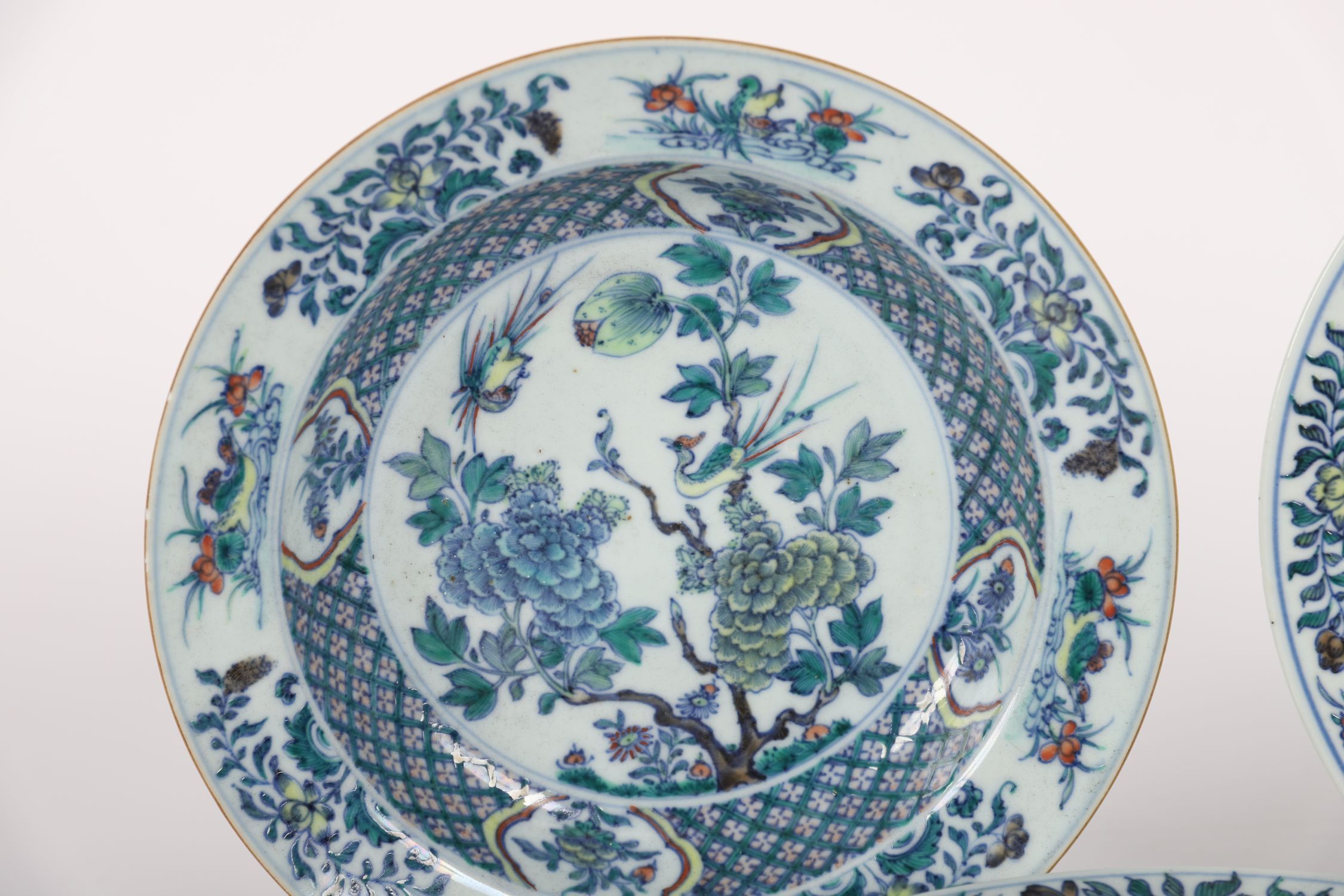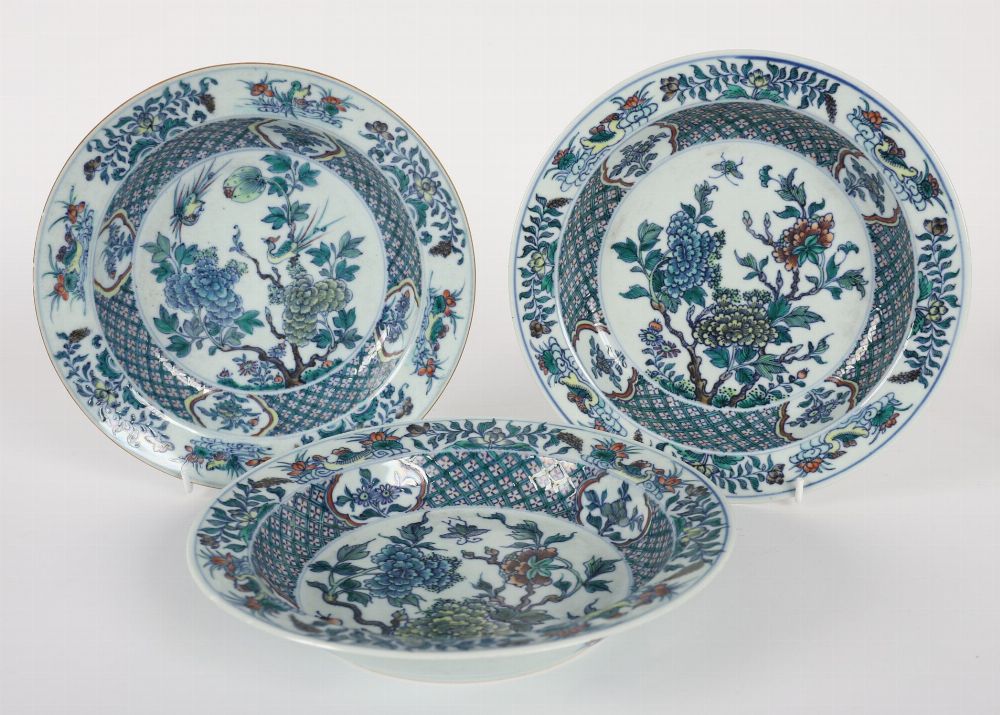 A set of three Chinese porcelain dishes, each with central flowering peony and foliage motifs within wide borders of diaper pattern and cartouches. Executed in underglaze blue with overglaze enamels including green, aubergine, and iron-red.