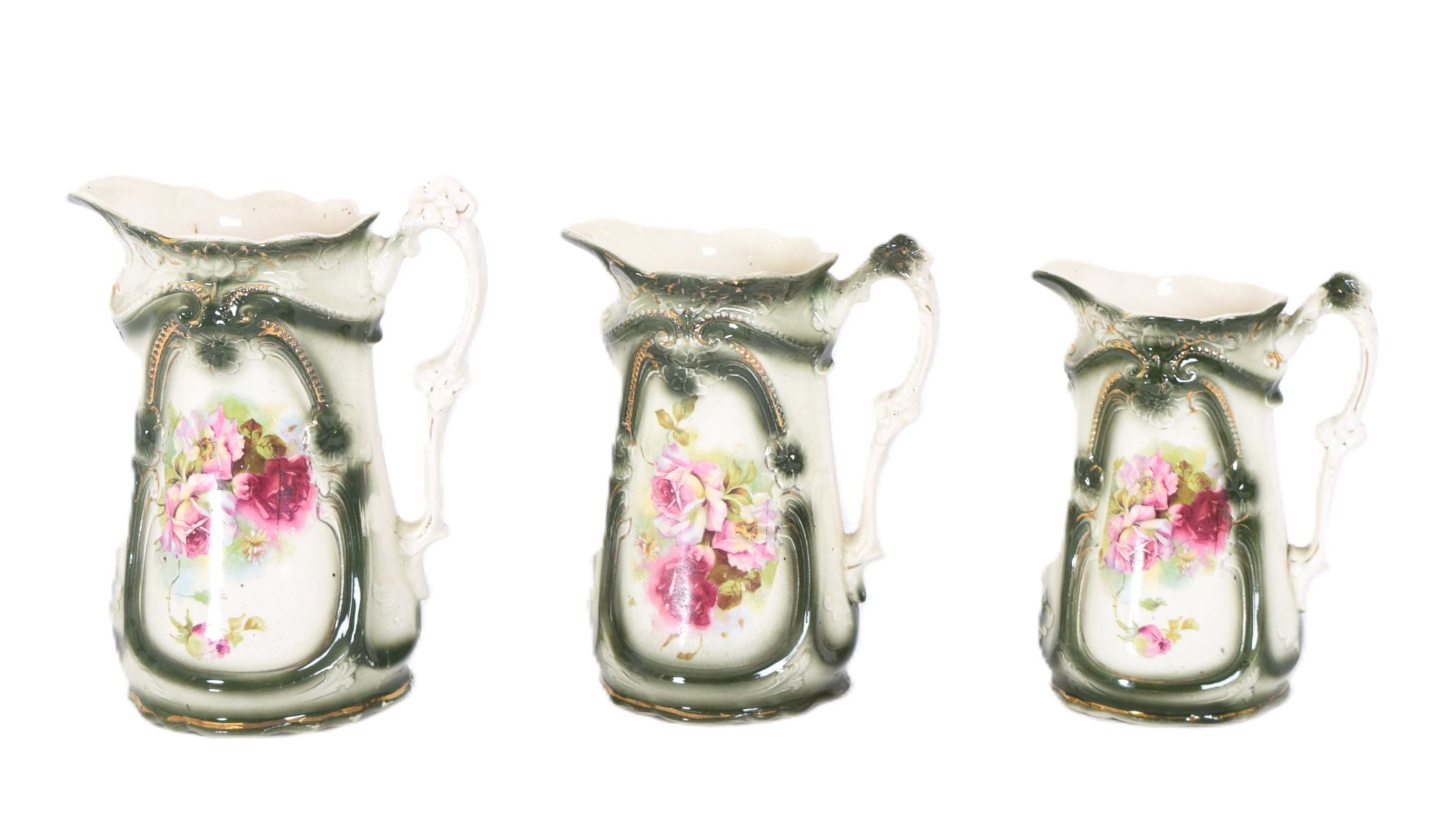 Set of three graduated ceramic jugs, each decorated with painted floral sprays and glazed finish.