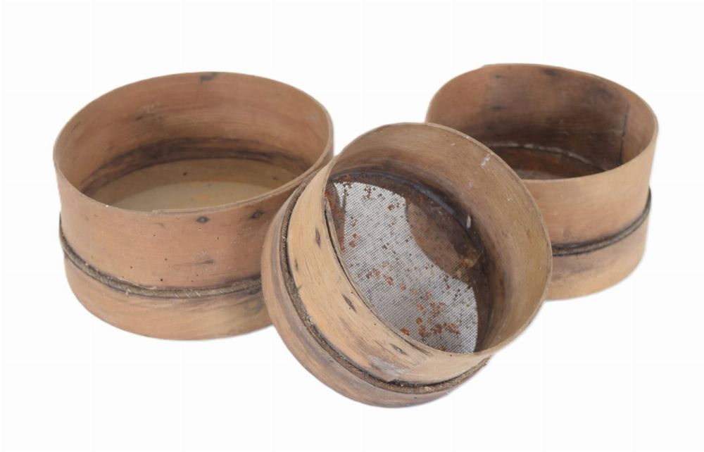 Set of three graduated sieves with wire mesh inserts.