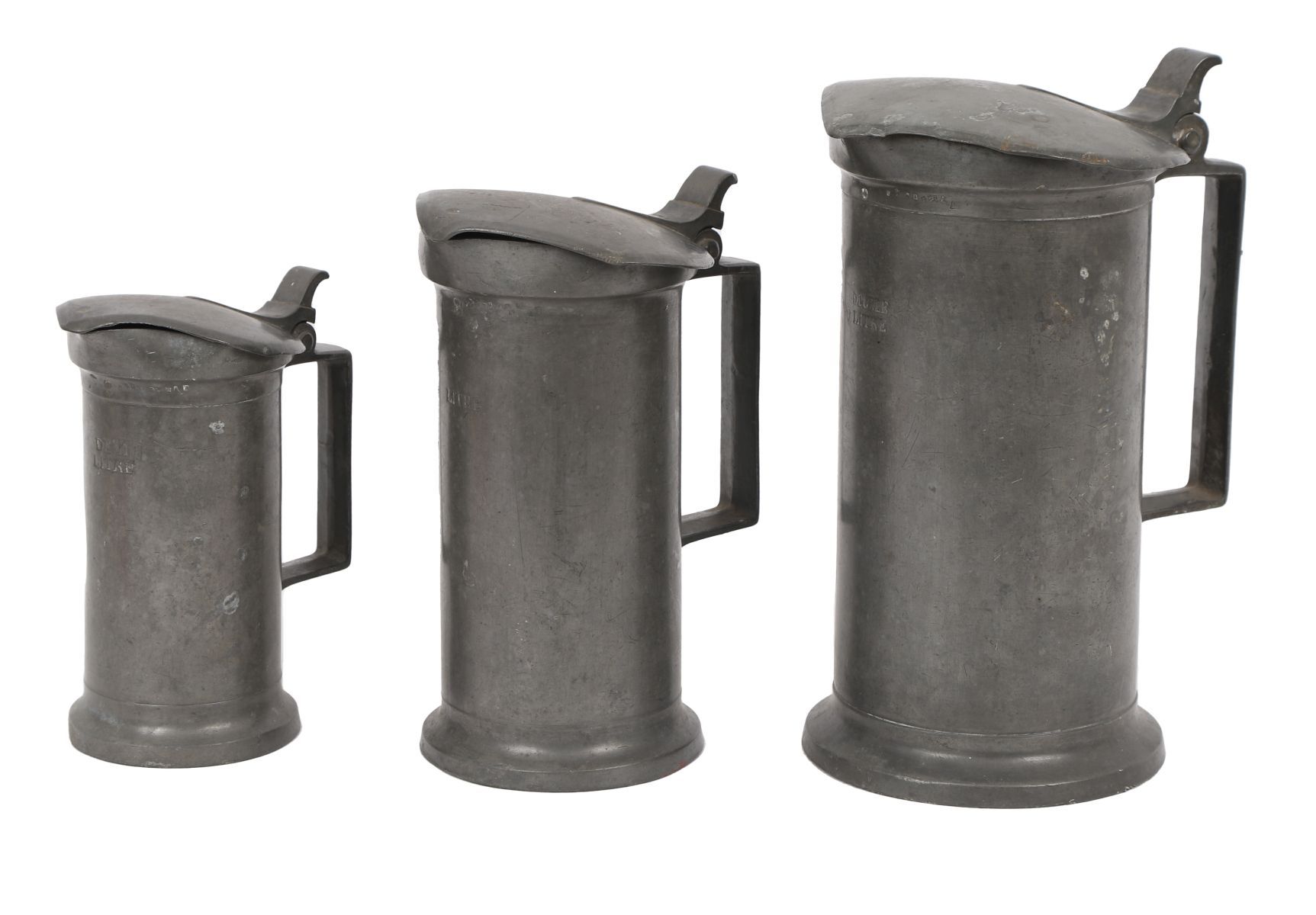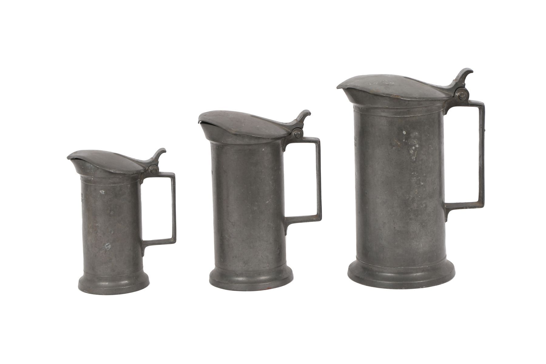 A set of three pewter jugs of graduated size, each with a cylindrical body, hinged lid and thumbpiece, displaying surface wear and patination.