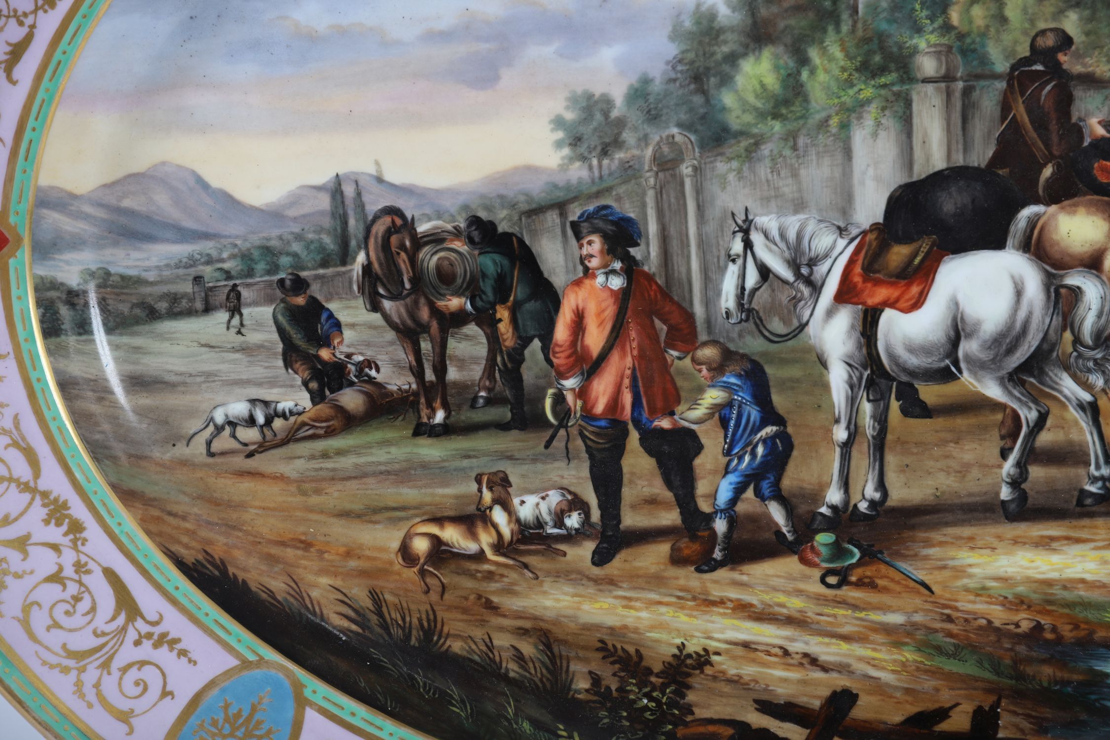 A large and finely painted 19th-century Sevres porcelain charger, depicting a detailed equestrian and hunting party in a classical landscape. The central panel is framed by a wide border in pink and bleu celeste with raised gilt scrollwork and alternating red and blue enamelled medallions.