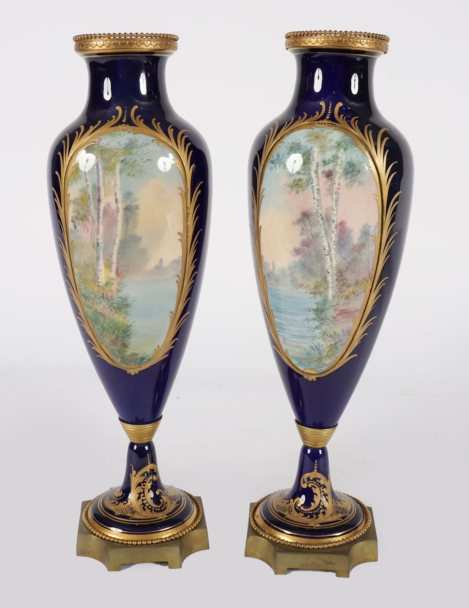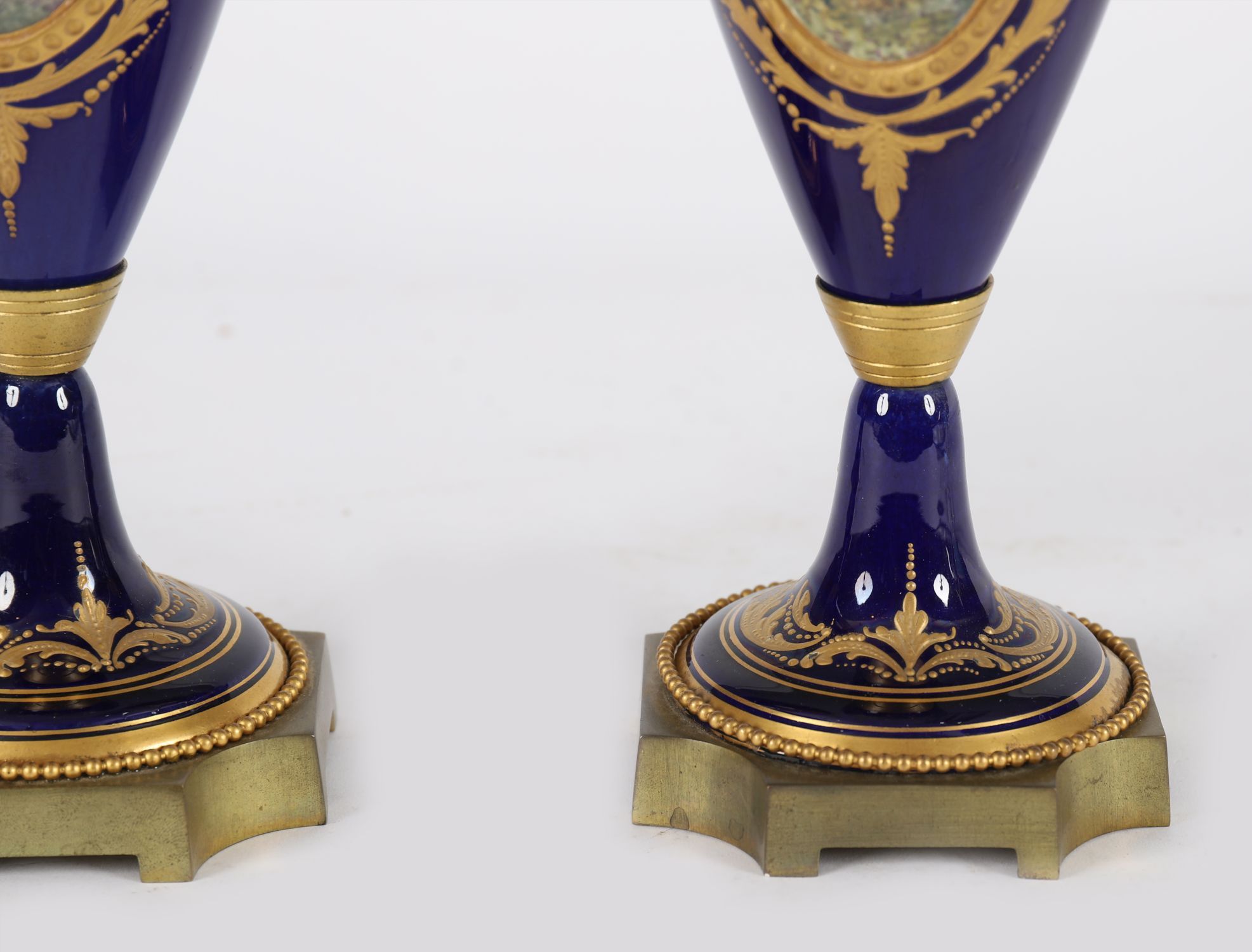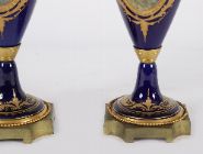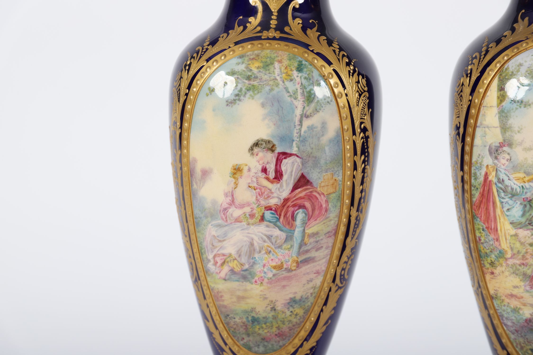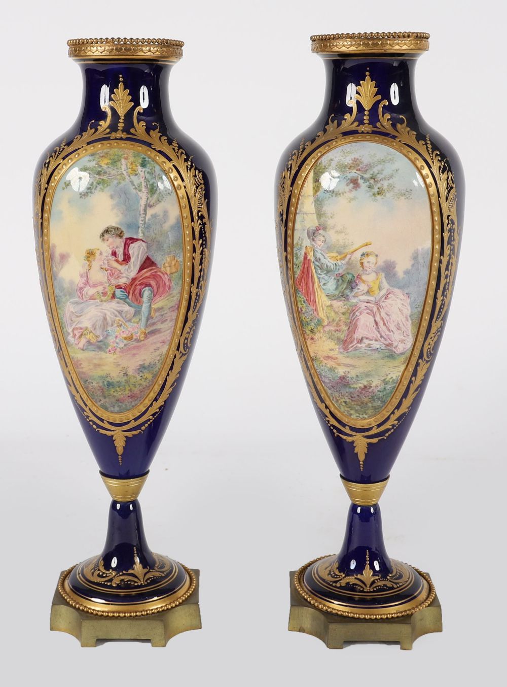 A fine 19th-century Sevres-porcelain vase, of baluster form on circular foot, decorated with a hand-painted romantic courtship scene within a gilt scrollwork cartouche on a deep bleu de roi ground. Mounted with a gilt bronze beaded foot rim.
