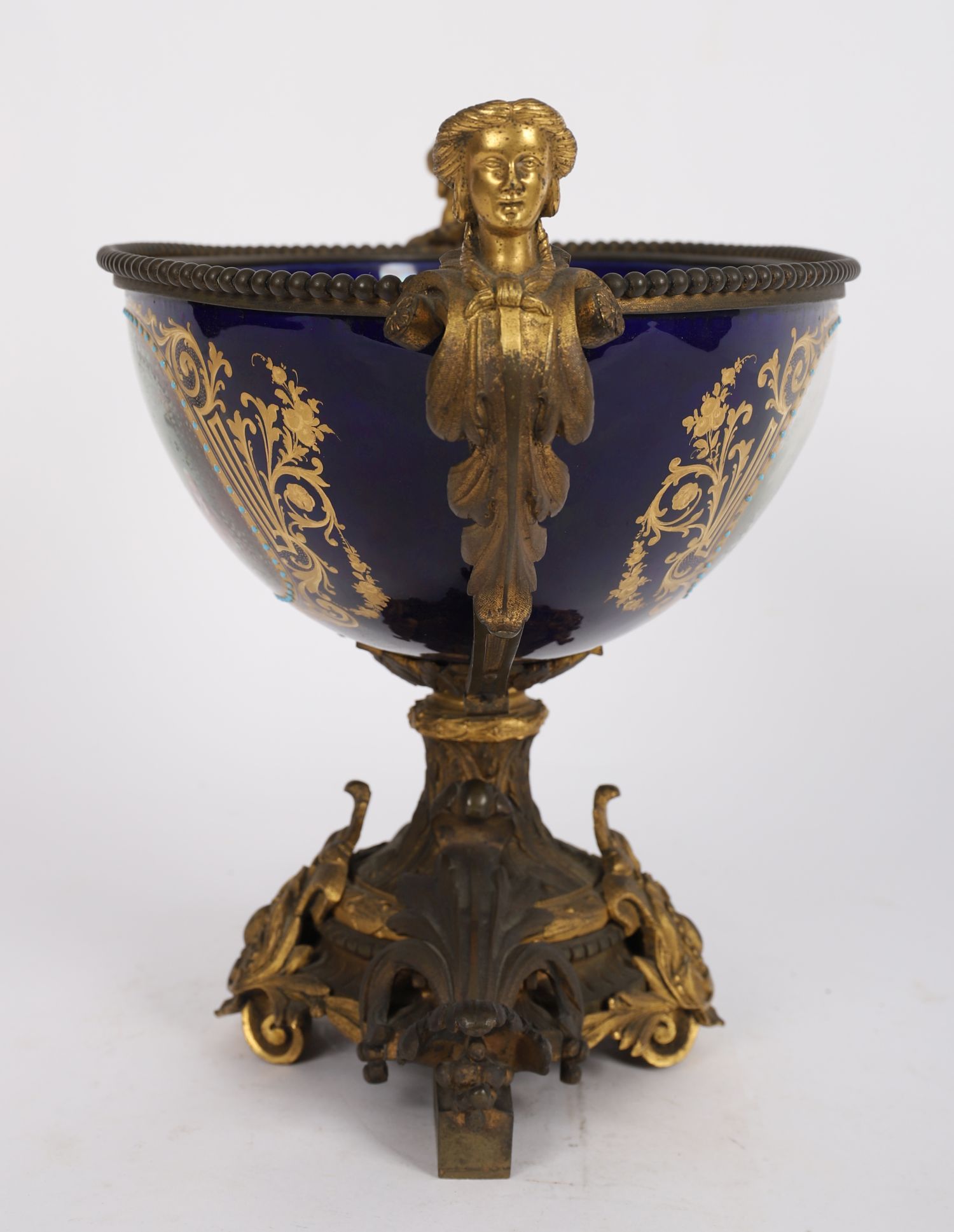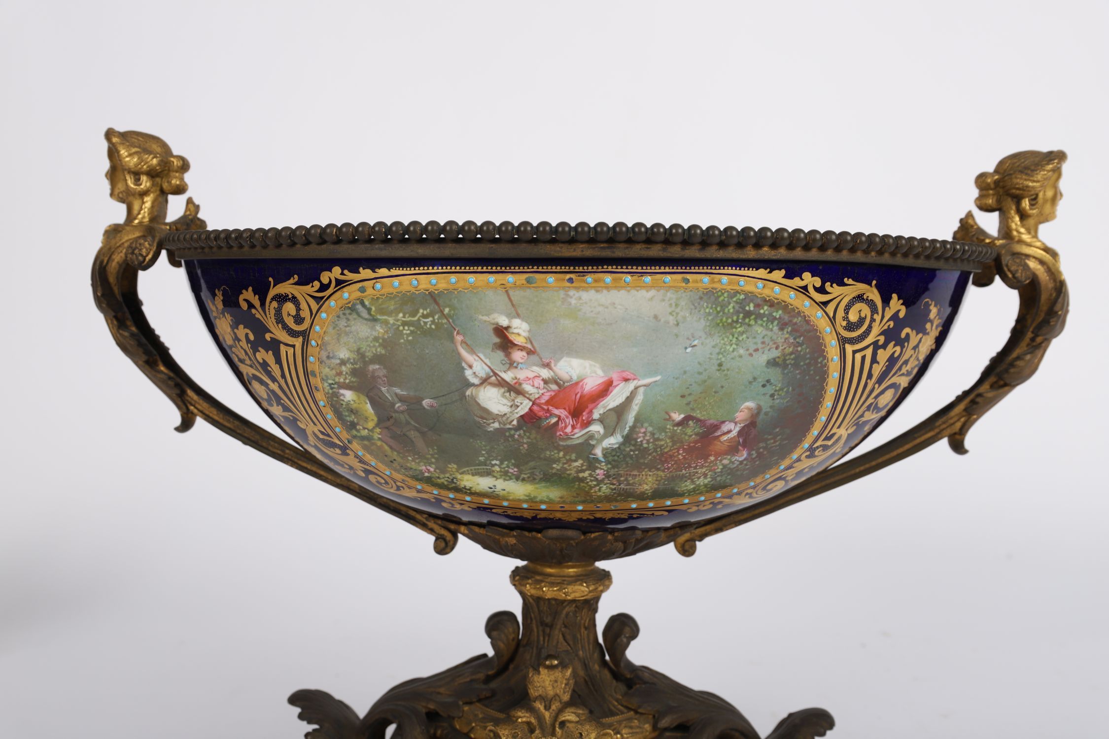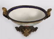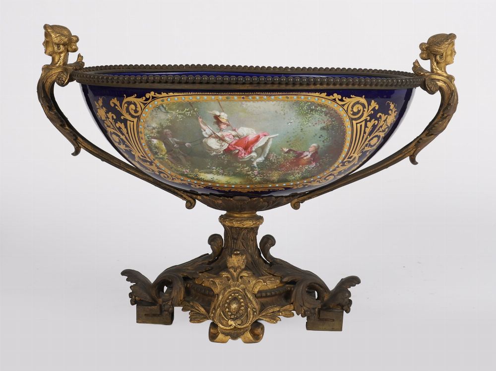 A 19th-century Sevres-style porcelain coupe, of oval form, finely painted with a romantic 18th-century scene in a landscape reserve, framed by elaborate gilt scrollwork on a rich bleu de roi ground. Mounted with gilt bronze handles in classical mask form and set on an ornate cast bronze base with acanthus and scroll motifs.
