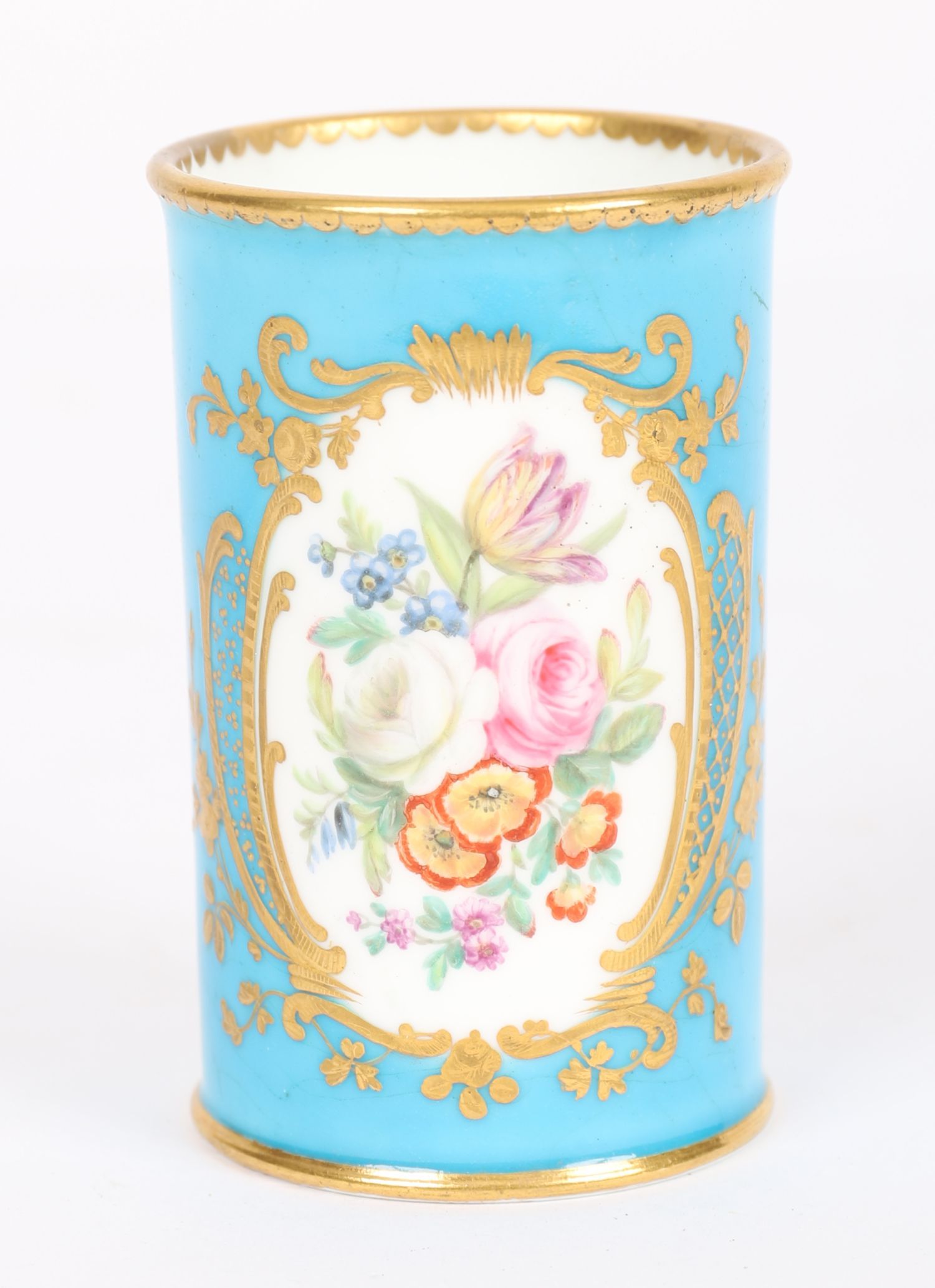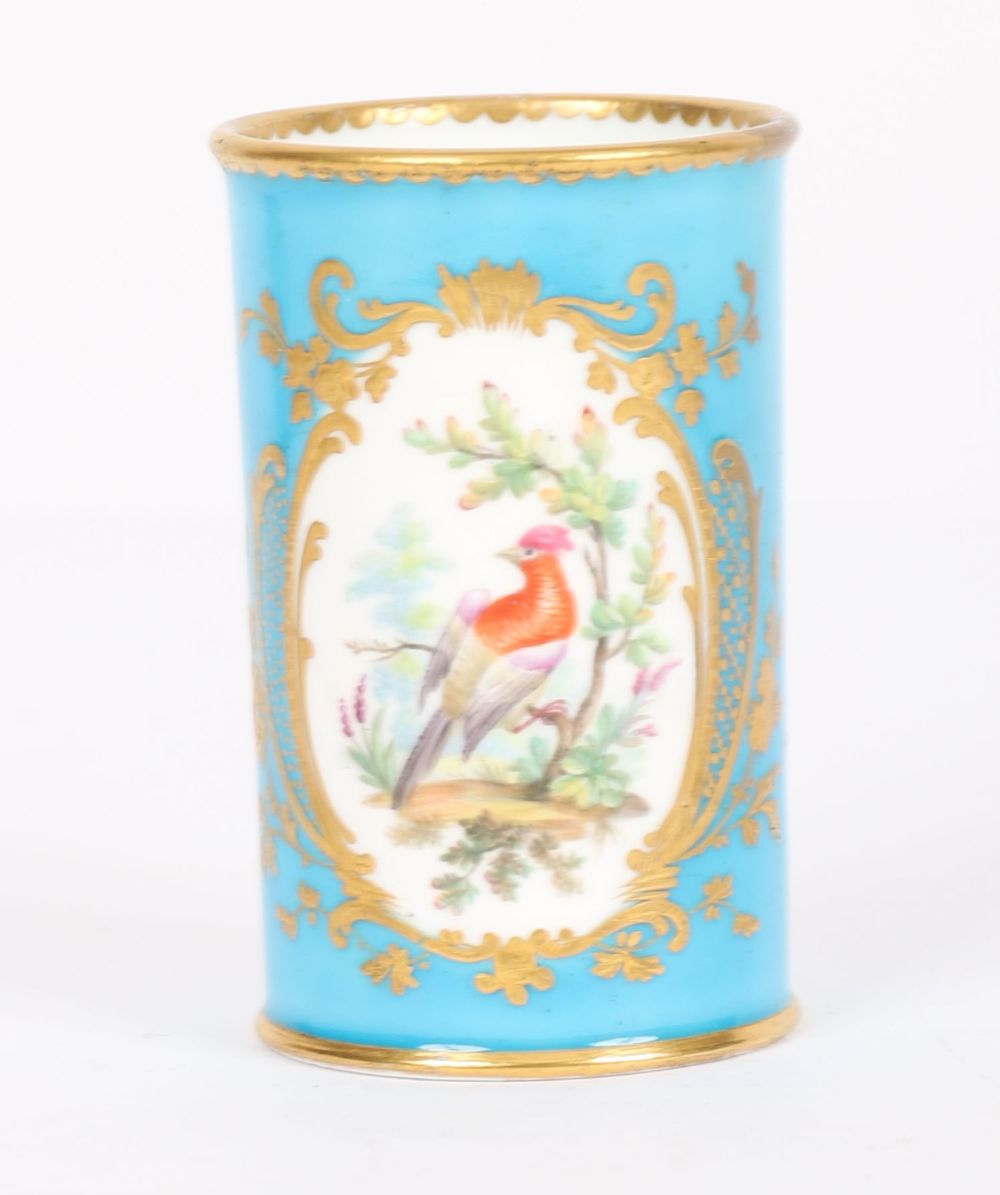 A 19th century Sevres-style cylindrical porcelain box, the turquoise ground painted with reserves of figures in landscapes, within raised gilt borders, and mounted in ormolu. A fine example of French decorative porcelain in the Louis XVI revival taste.