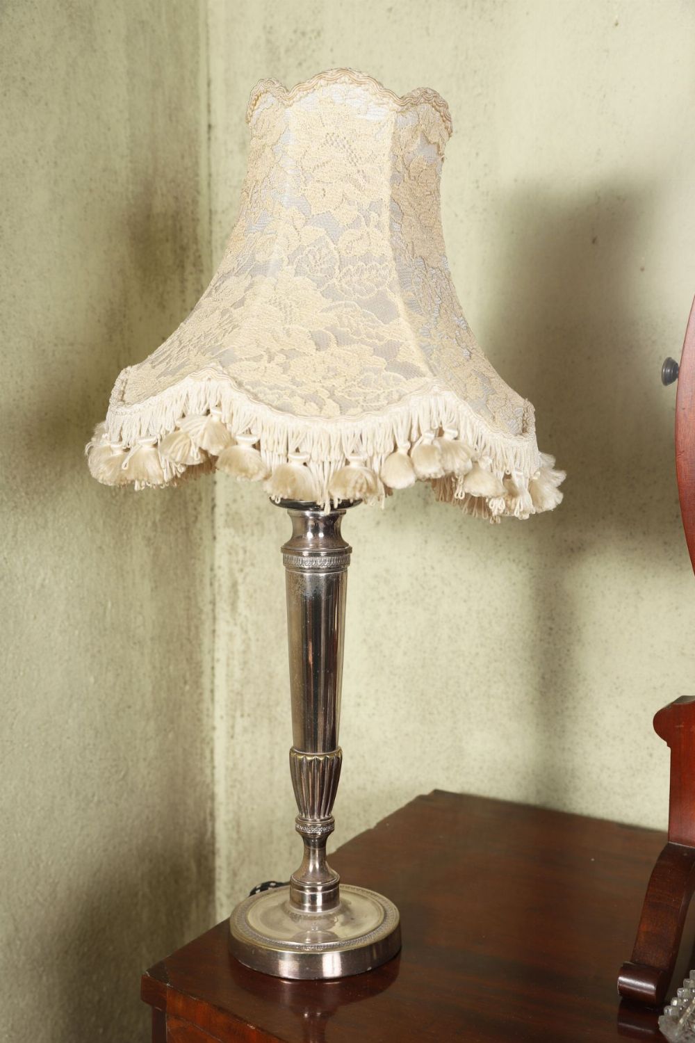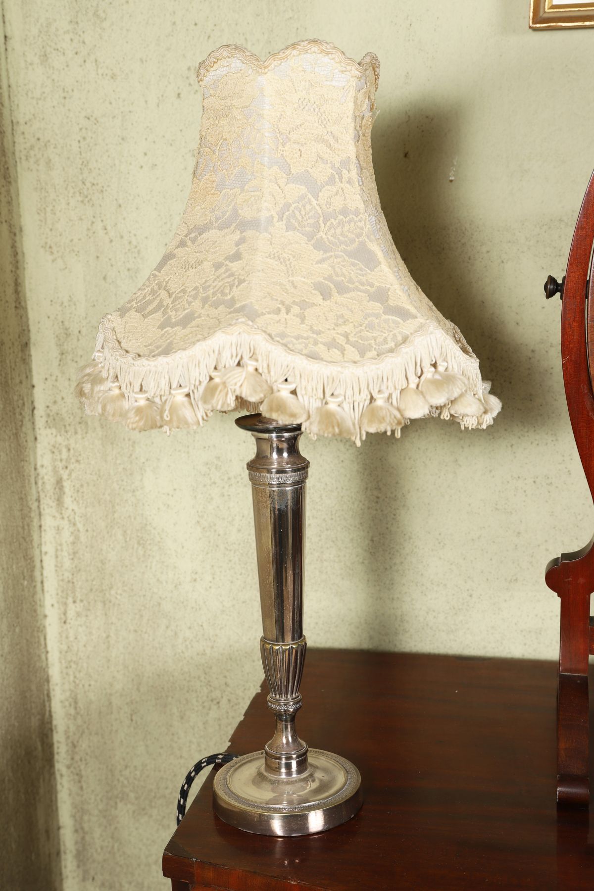 A Sheffield-plated table lamp with turned stem rising from a circular weighted base, fitted with a fabric shade with decorative fringe.