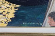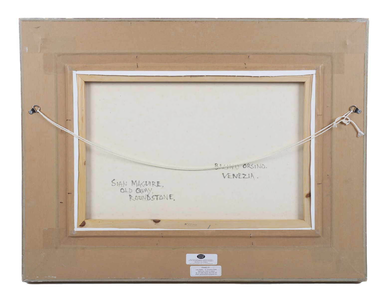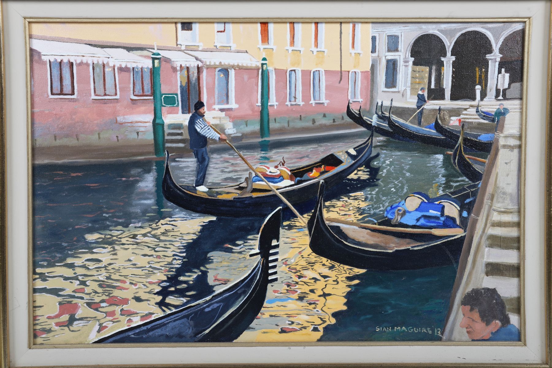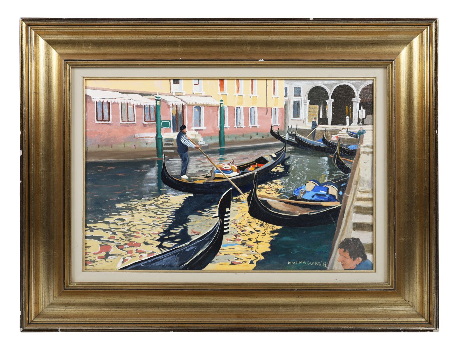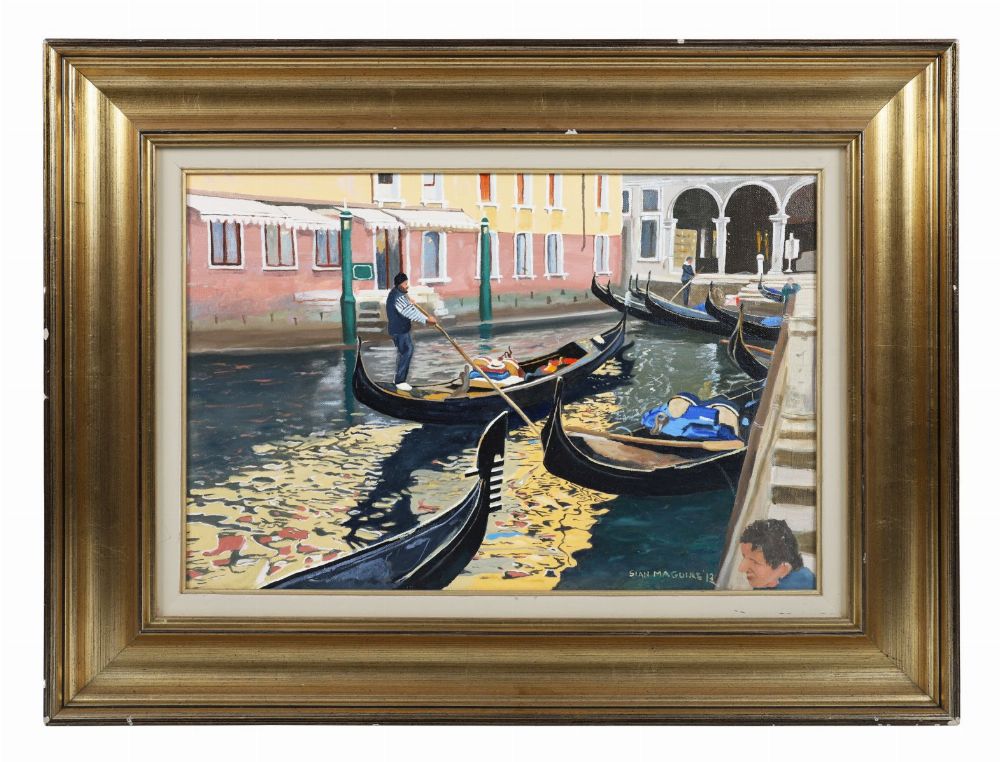 Depicting gondolas moored along a sunlit Venetian canal, this work combines structured composition with lively reflections and harmonious tones. Maguire’s modern realist style captures the charm and geometry of the Venetian waterways.
