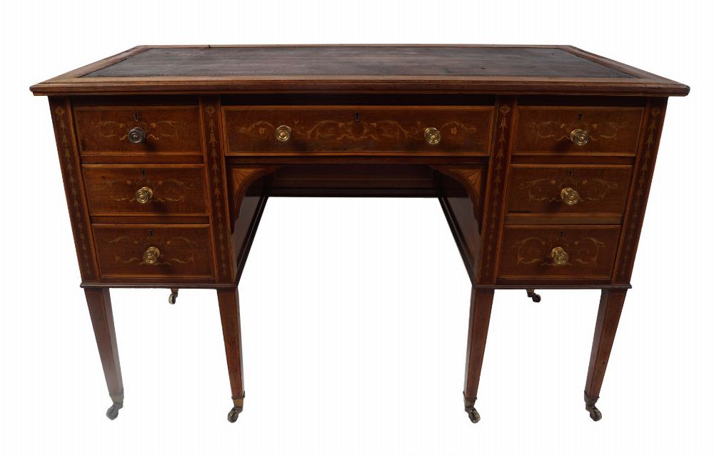 the tooled leather inset rectangular shaped top above a series of 7 profusely inlaid drawers, furnished with brass knobs, raised on square tapered legs, terminating on brass cup castors.