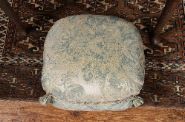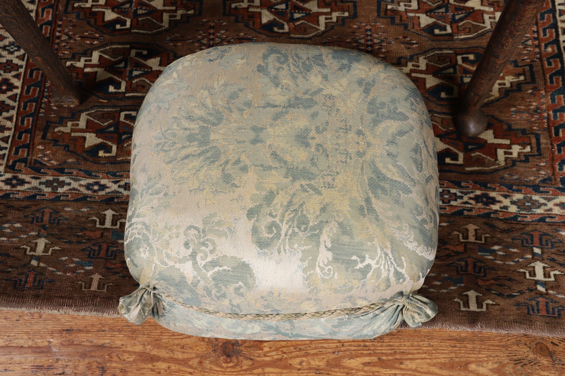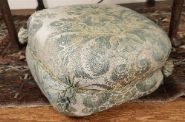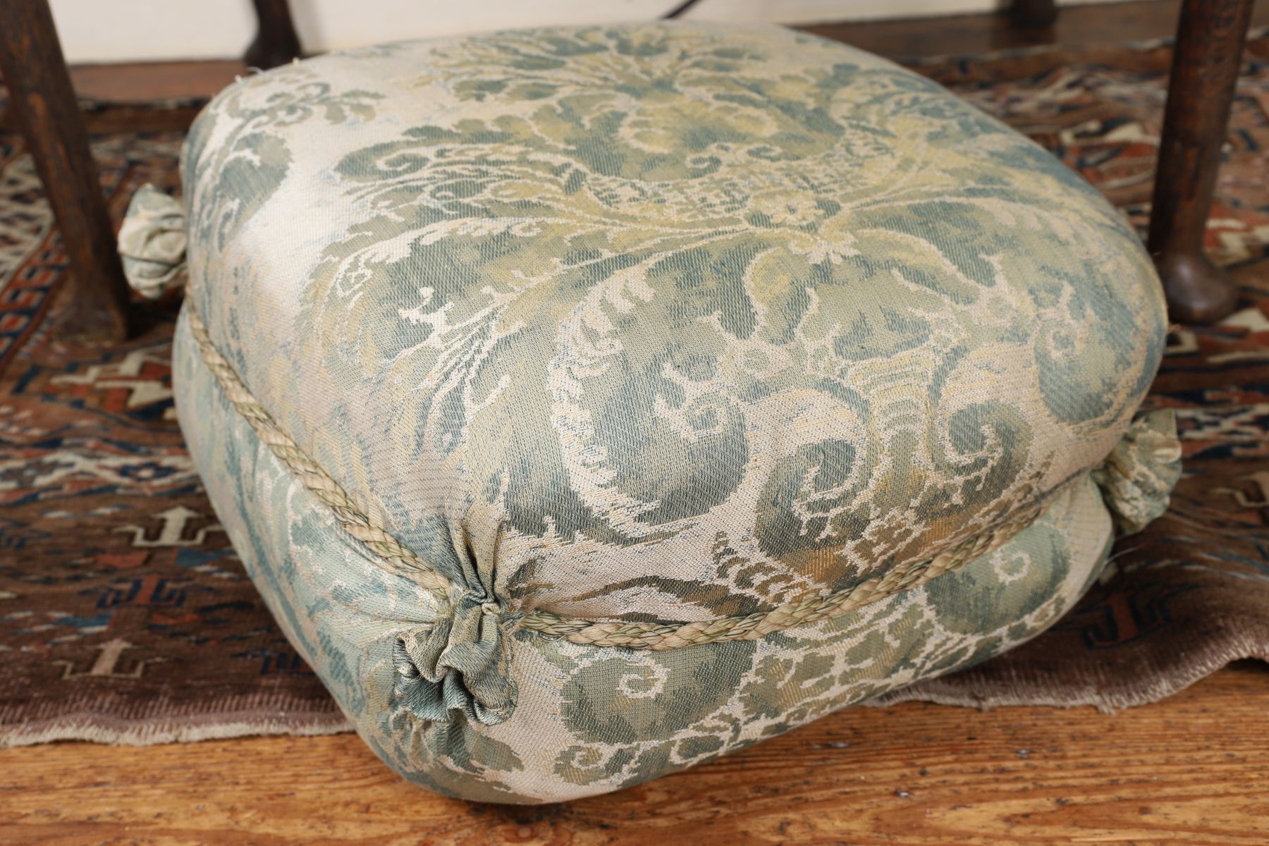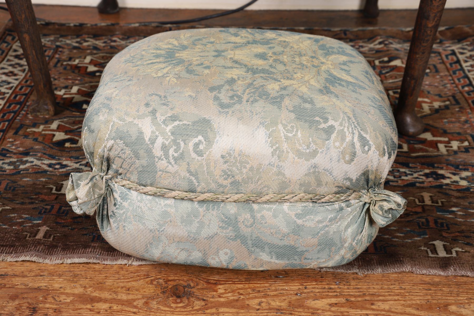 A silk-upholstered pouffe of square form, finished with piping and decorative ties, the fabric showing floral patterning in soft tones. 20th century.