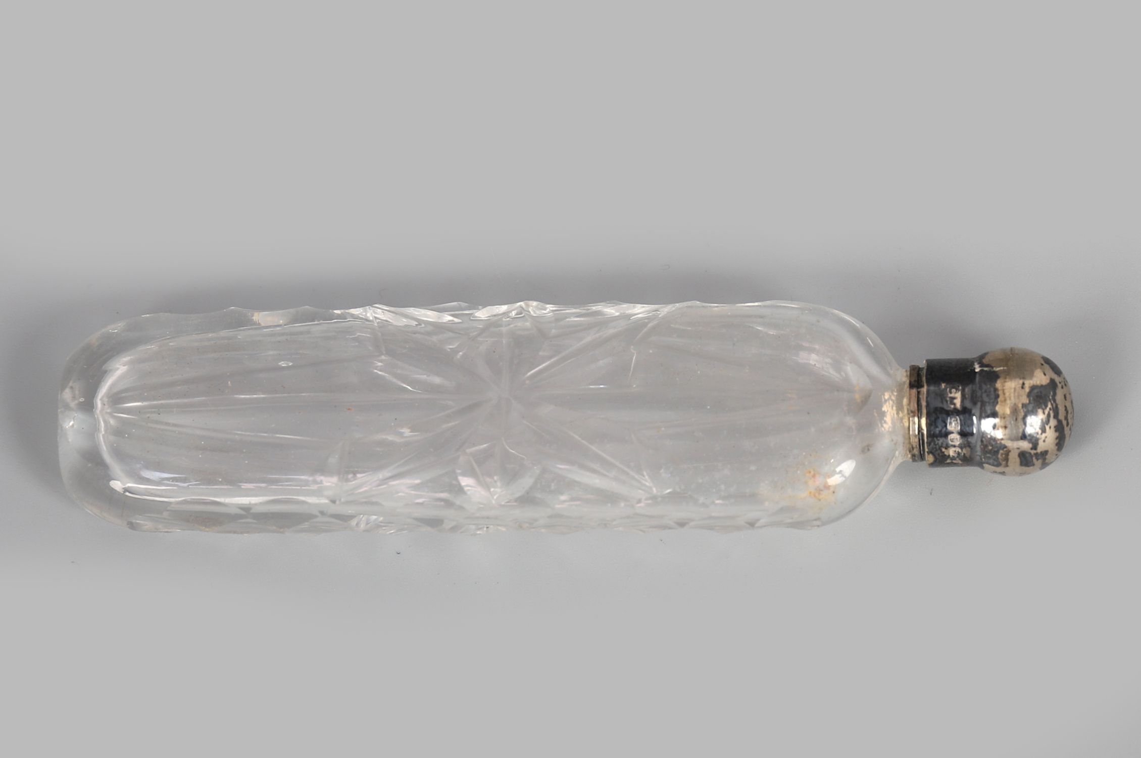 A cut crystal perfume bottle with star-cut decoration, mounted with silver collar and hinged cover.