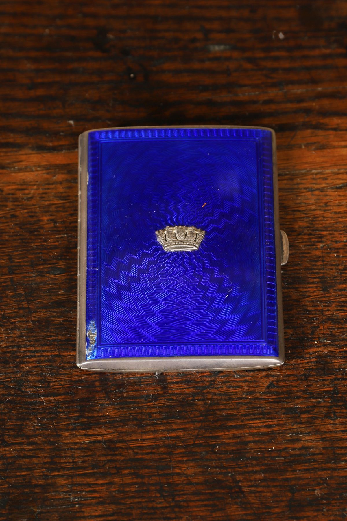 A silver and enamelled cigarette case, rectangular in form, the exterior decorated with deep blue guilloché enamel centred by a crown motif in relief. Hallmarked Birmingham. Circa 1900.