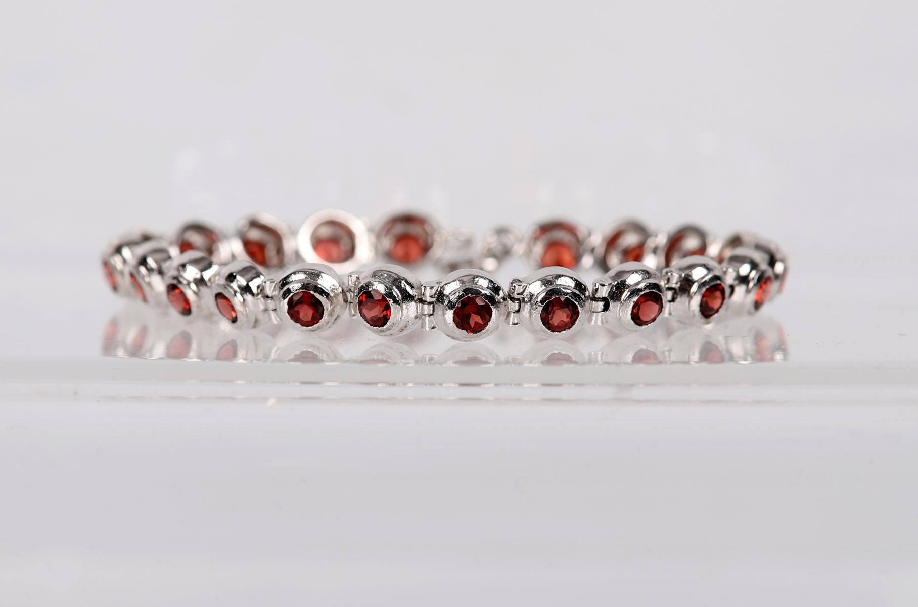 A silver bracelet set with a continuous line of round-cut garnets in rub-over settings, with secure clasp.
