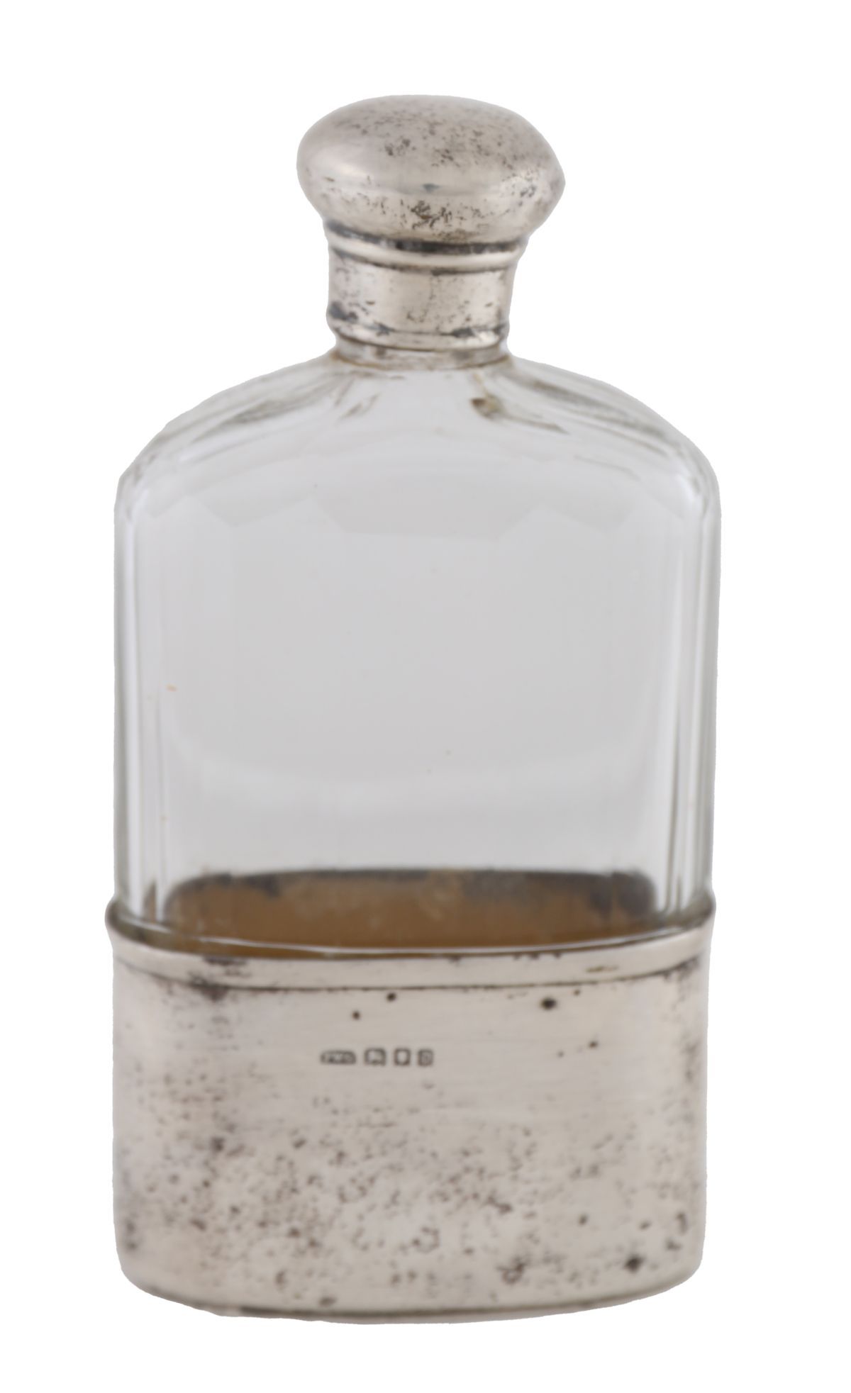 A silver-mounted glass hip flask with faceted body and domed screw cap, hallmarked London 1919.
