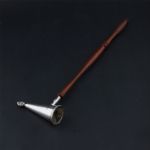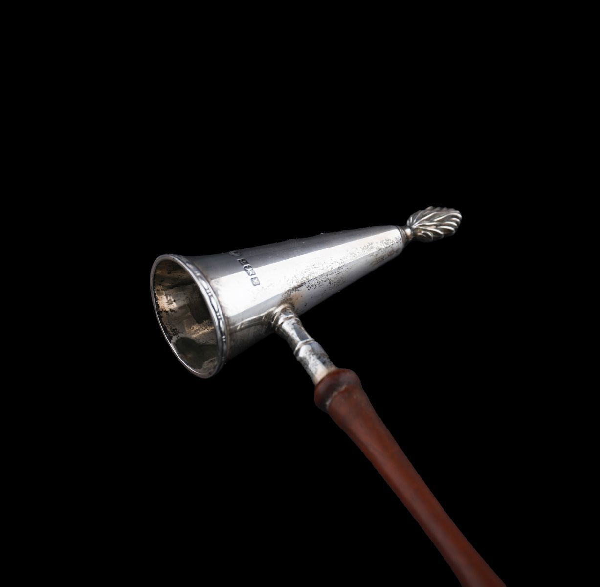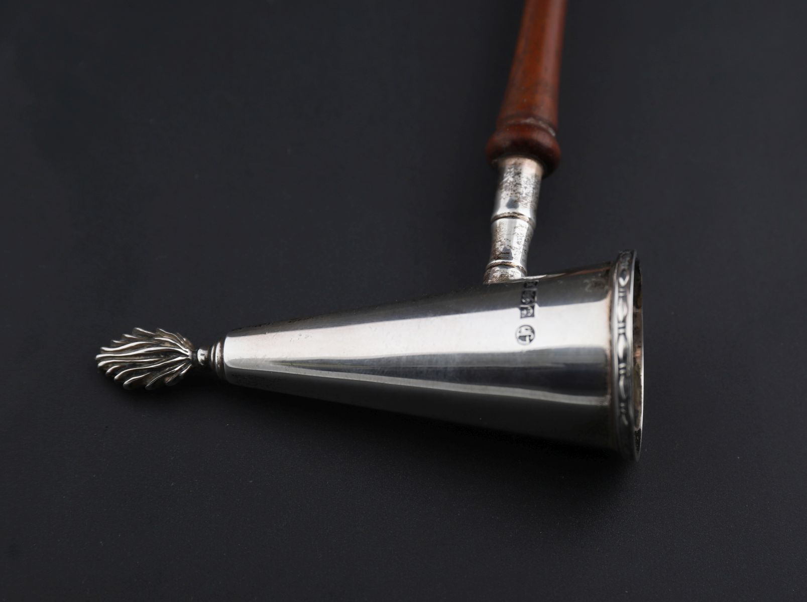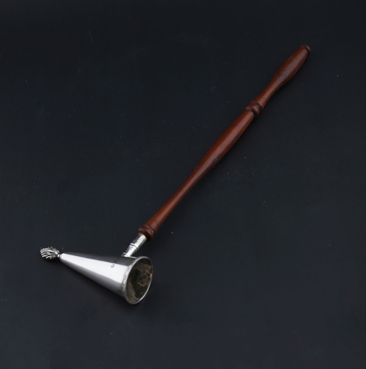 A silver candle snuffer with conical extinguisher mounted on turned wooden handle.