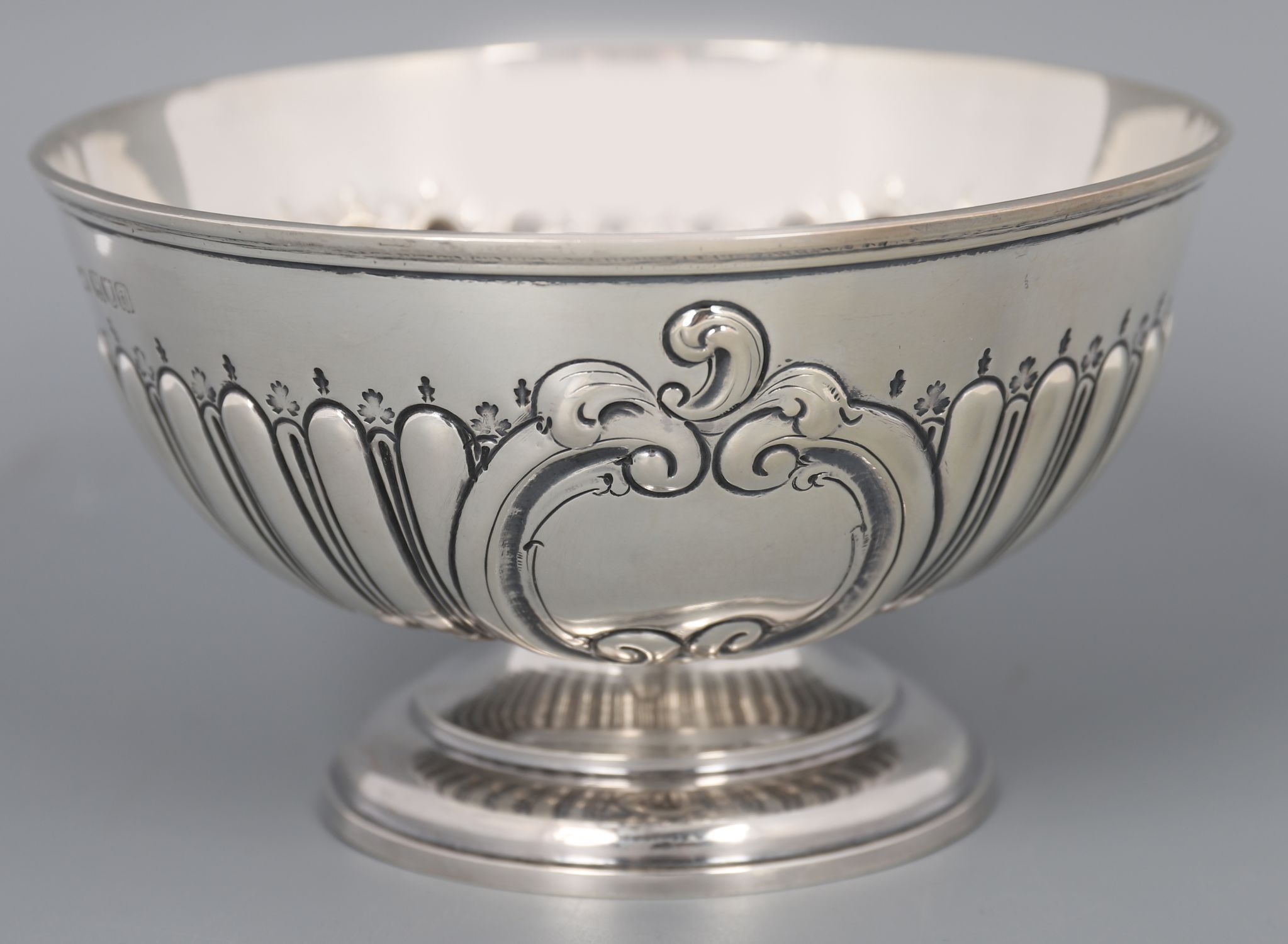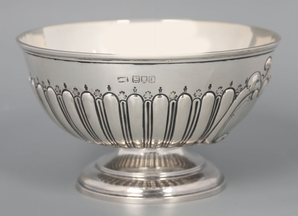 of circular repousse reeded form with a vacant armorial cartouche, raised on a circular foot. London 1899. 250 grams.