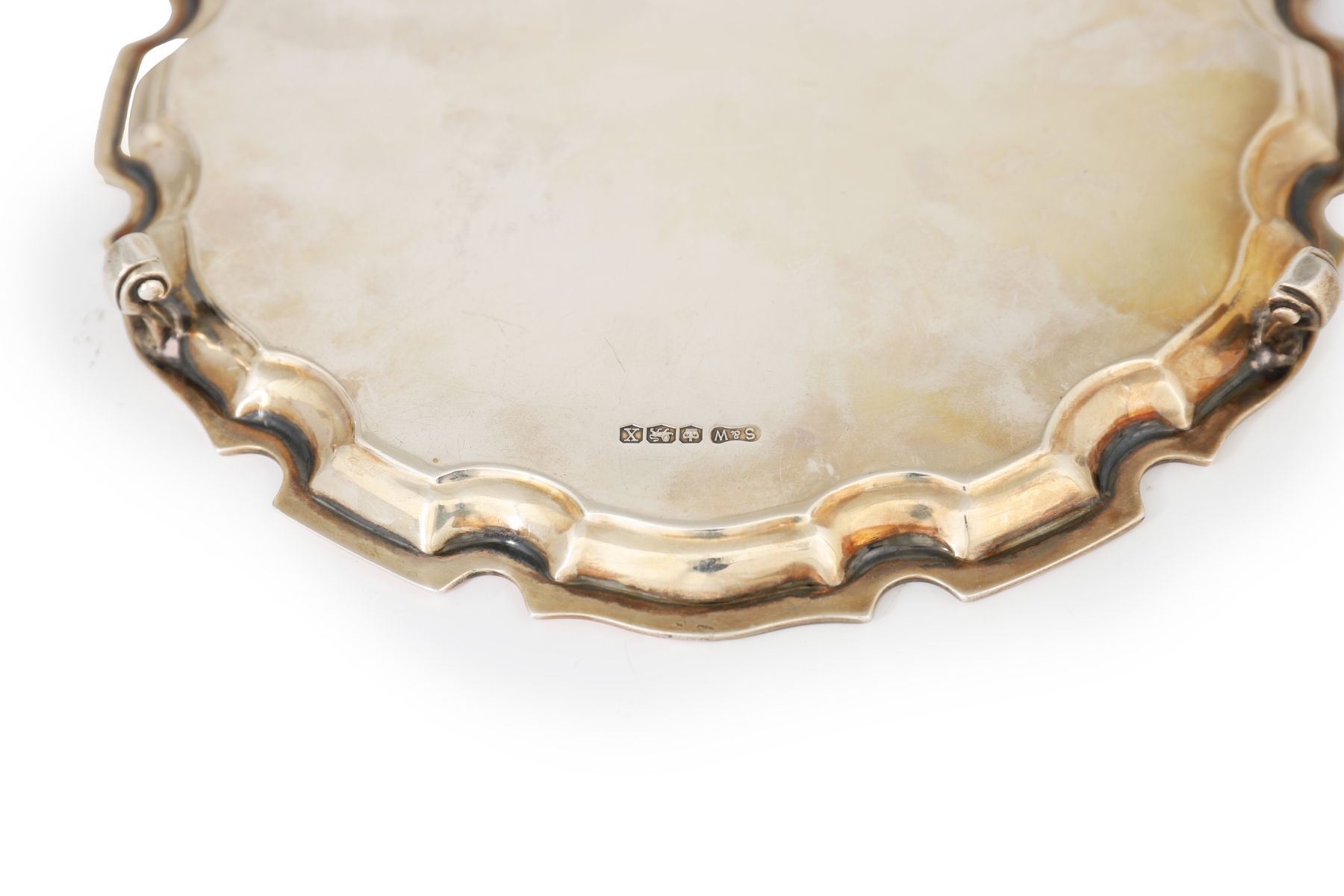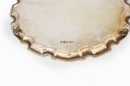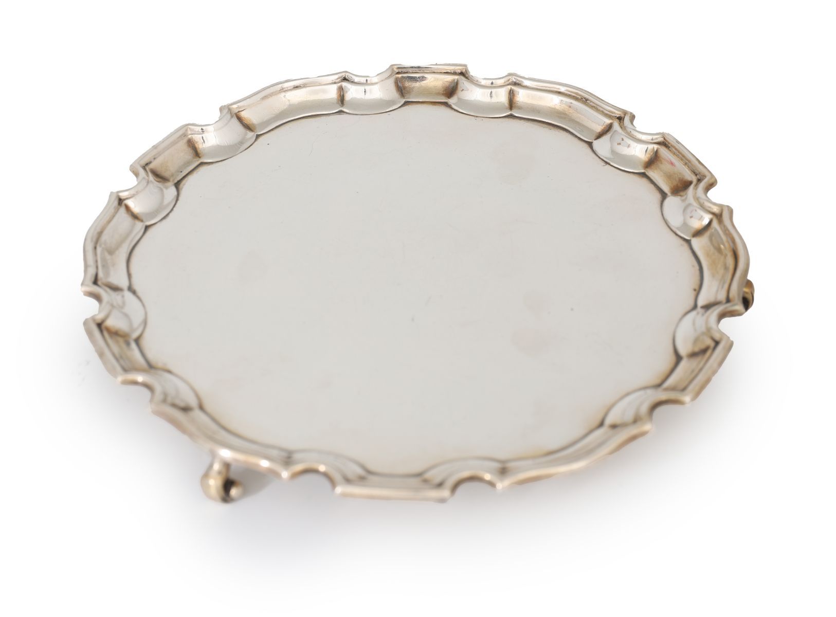 of circular serpentine shape with a pie crust border, raised on scroll feet. Sheffield 1940. Maker: Stower & Wraggs. 419 grams.