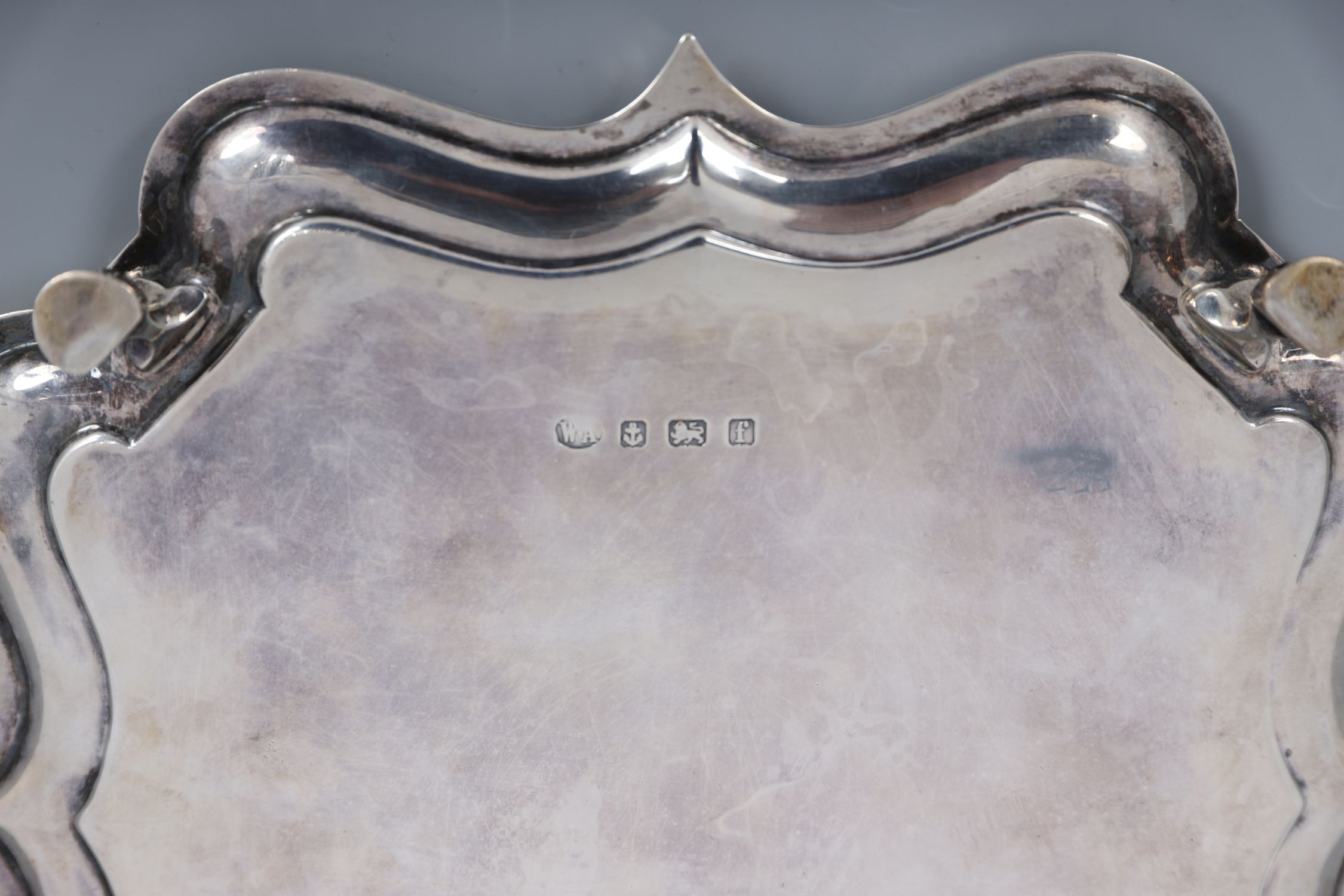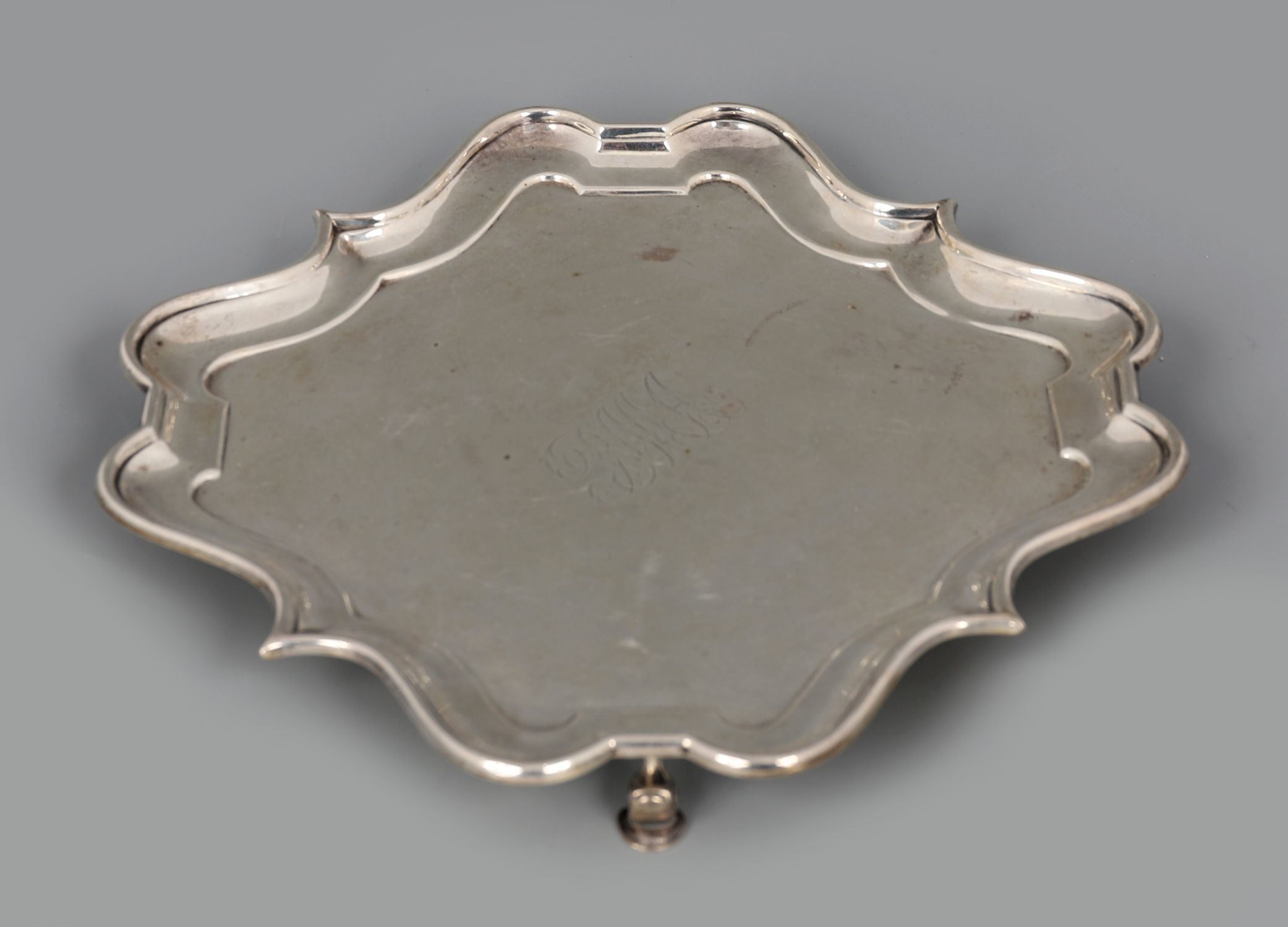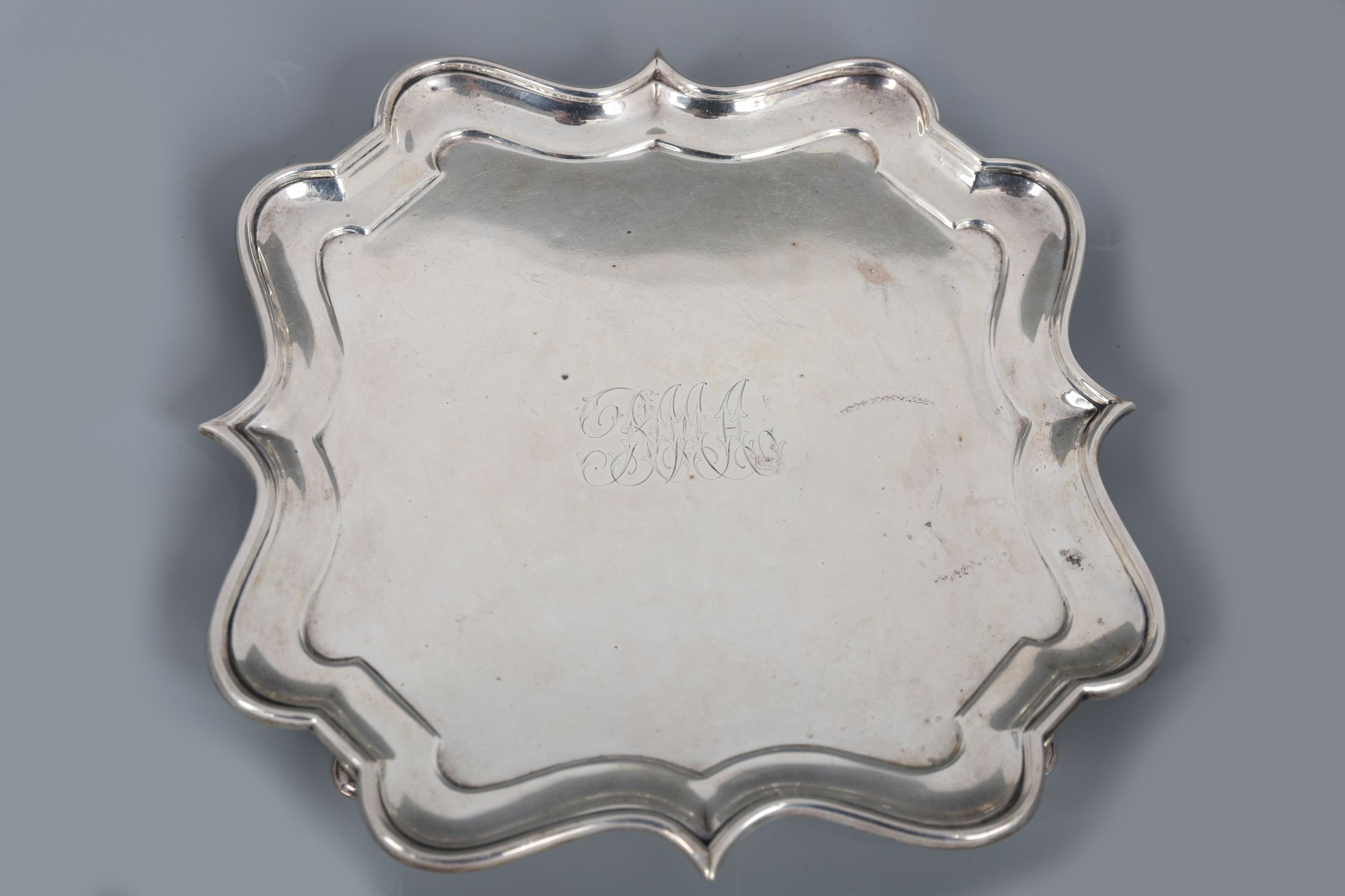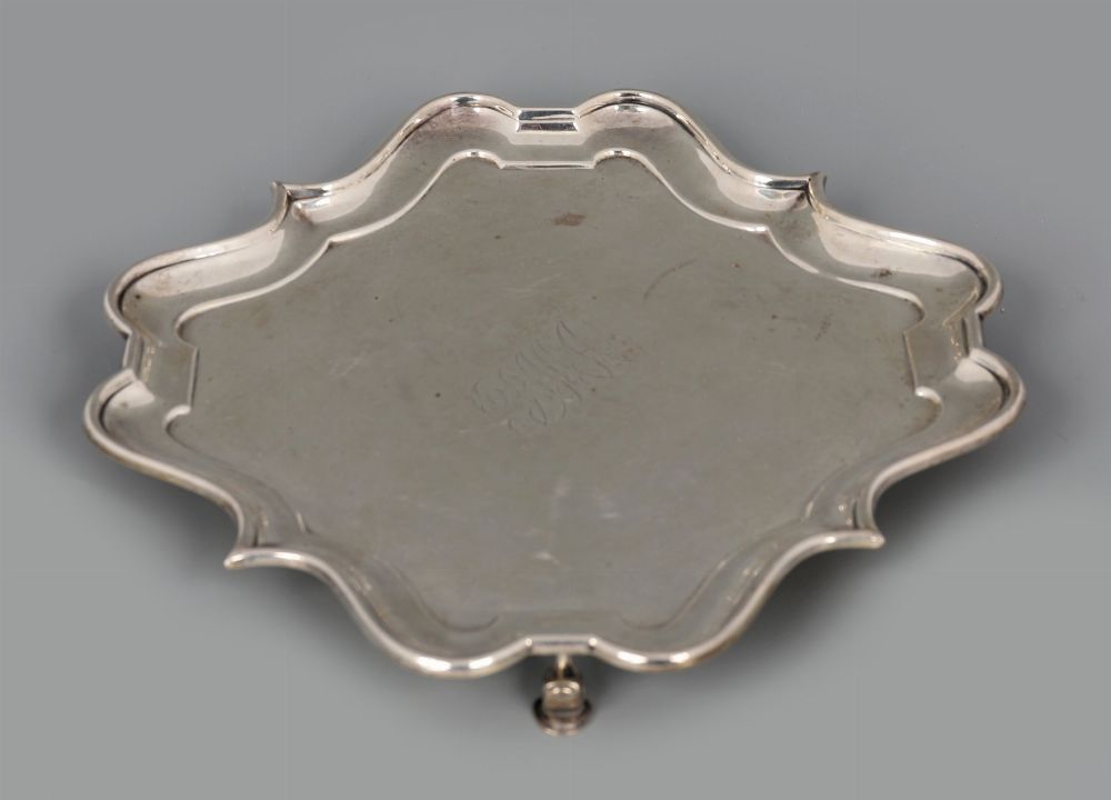 A silver card tray of shaped square outline, raised on scroll feet, with engraved monogram to centre. Hallmarked Birmingham 1905, maker's mark WA.
