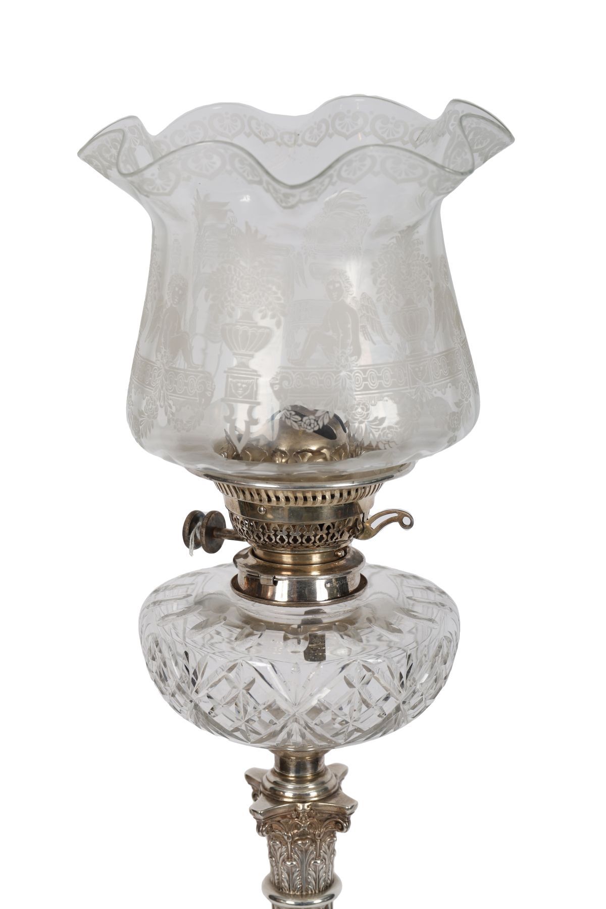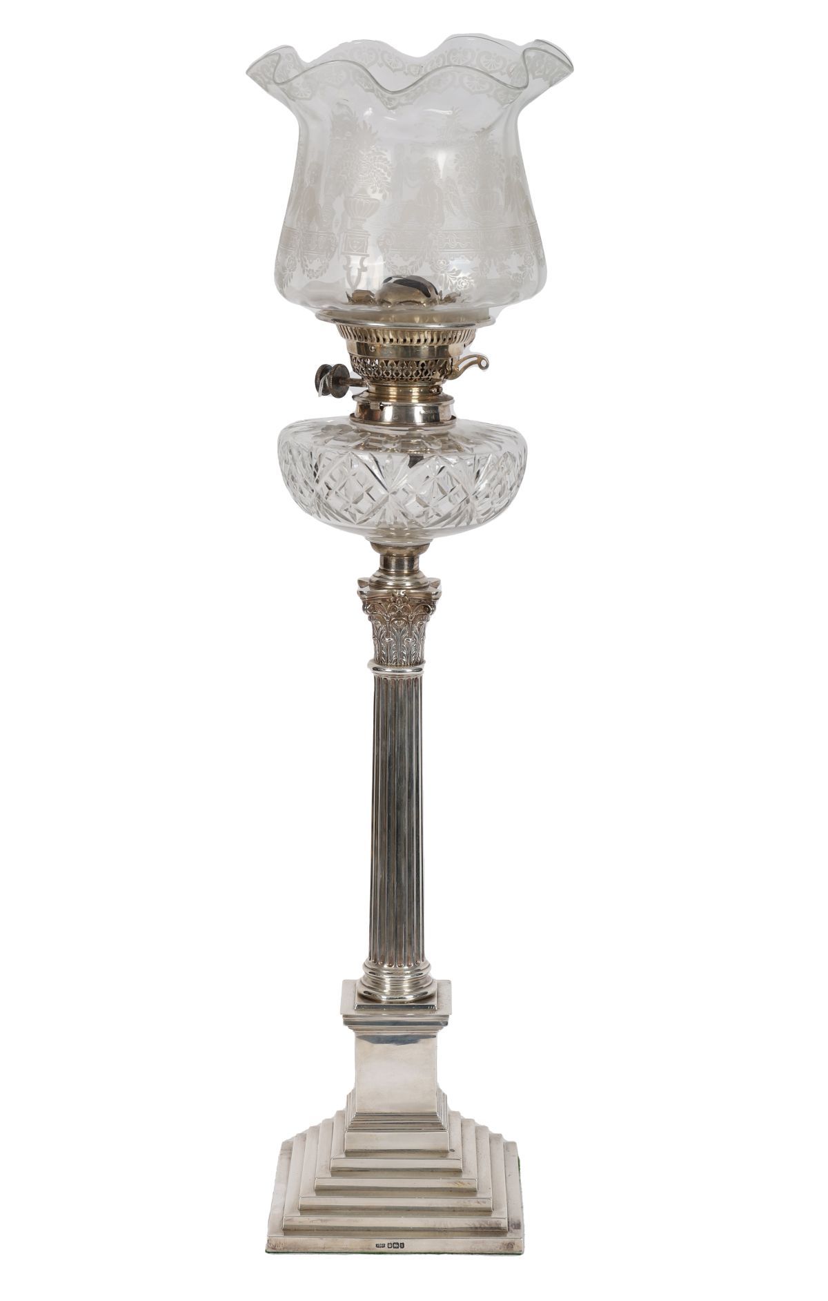 A silver Corinthian-pillared oil lamp, fitted with a cut-crystal reservoir bowl and an engraved glass shade, raised on a stepped square base. Late 19th / early 20th century.