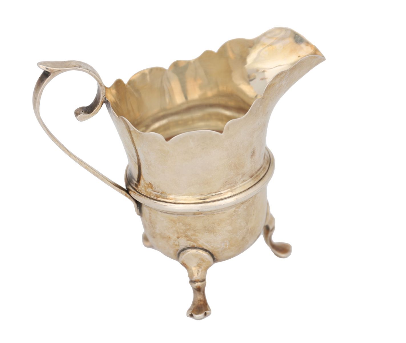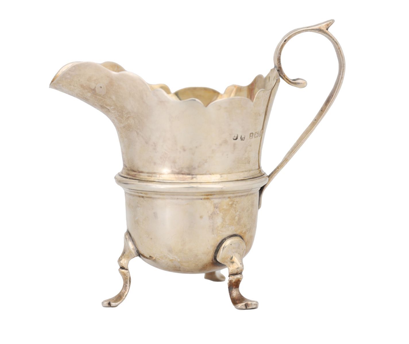 raised on cabriole legs and trefid feet, furnished with a scroll handle. Birmingham 1909. 50 grams.