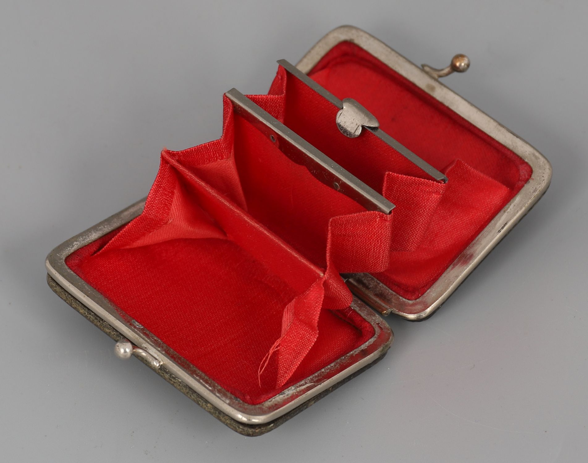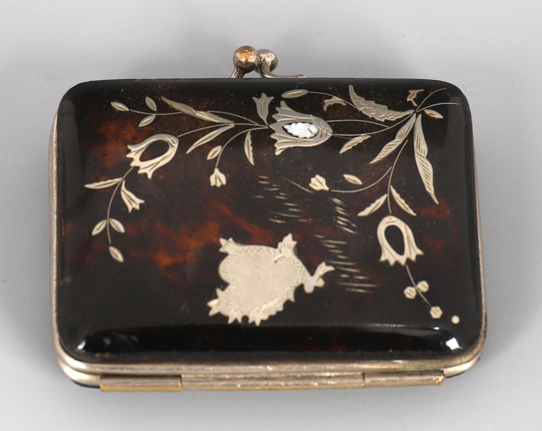 A 19th century tortoiseshell purse, rectangular with silver floral and heart-shaped inlay, fitted with gilt-metal clasp.