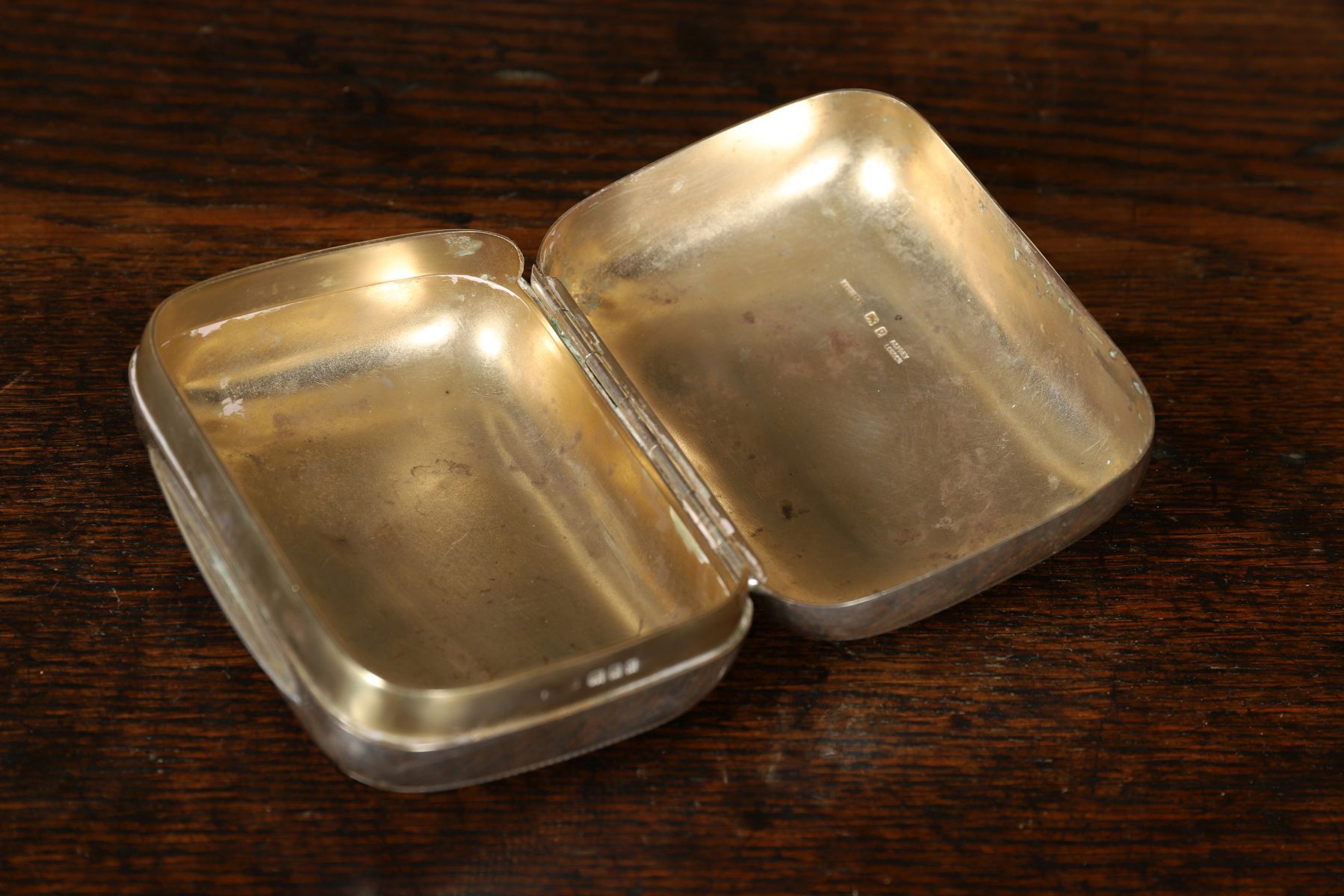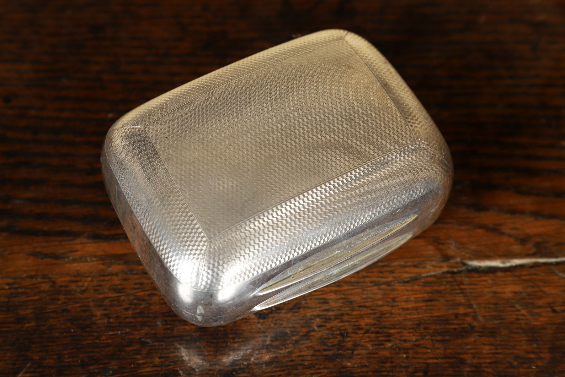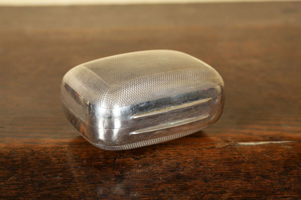 Rectangular hinged silver jewellery box of plain form, the exterior engine-turned, the interior fitted and lined. Asprey's London. Early 20th century.