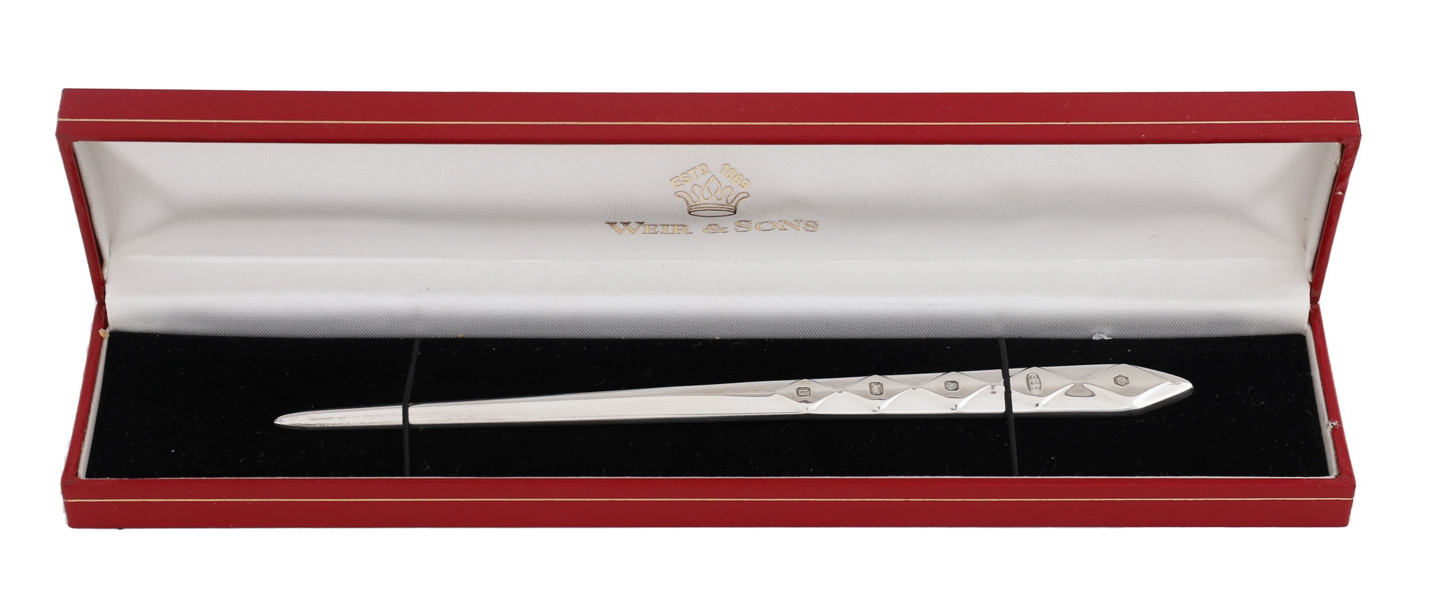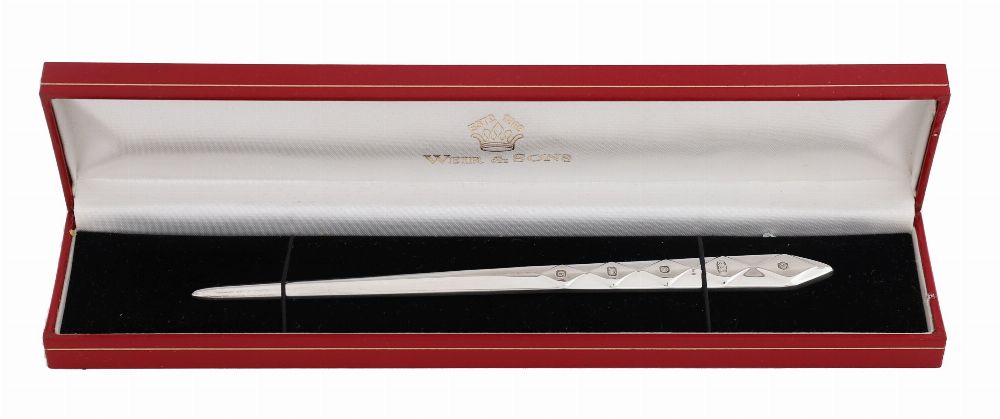 A silver letter opener by Weir & Sons, with engine-turned decoration, contained in original fitted leather case.