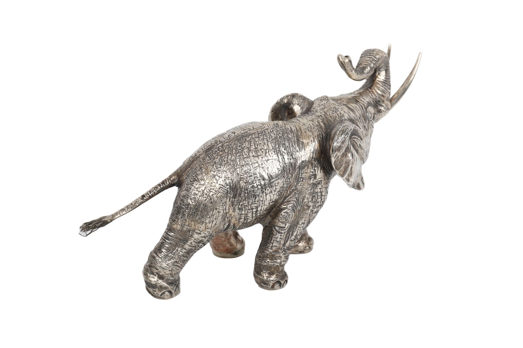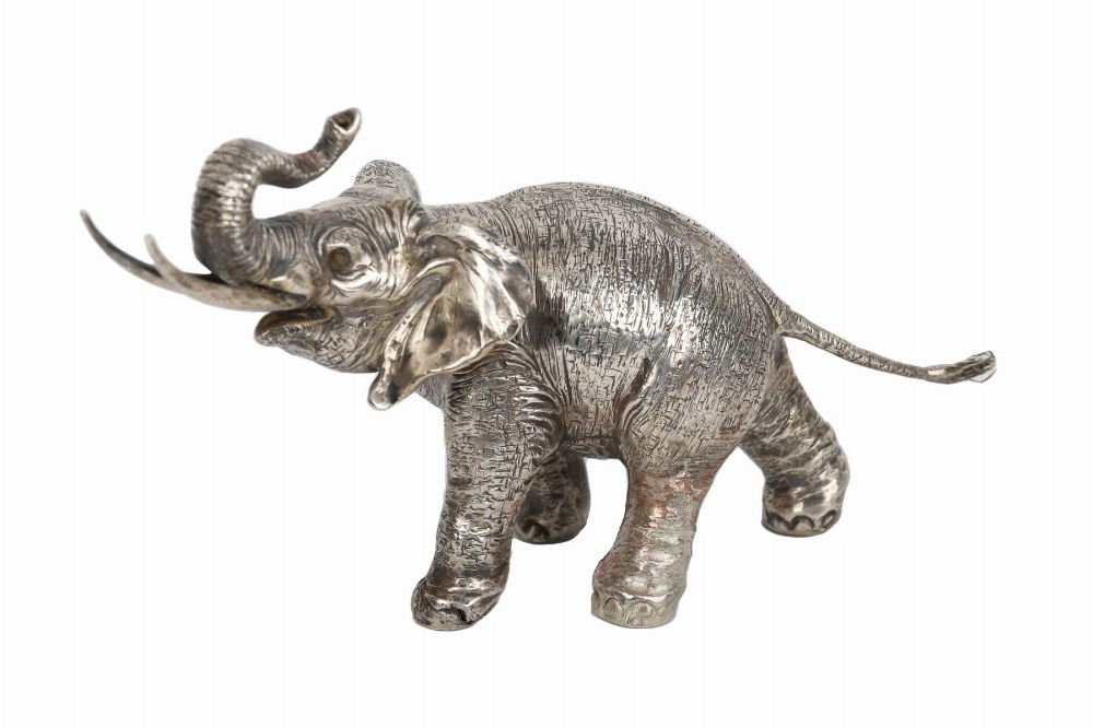 A well-modelled silver elephant with raised trunk and detailed hide texture, exhibiting fine craftsmanship and naturalistic movement. 447 grams.