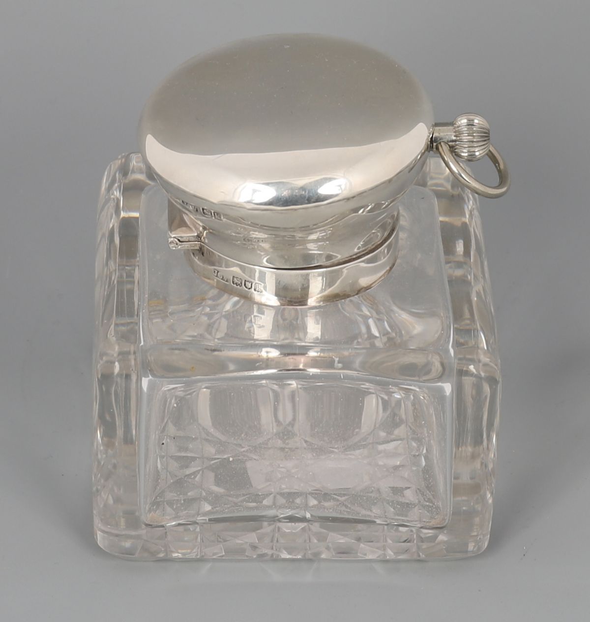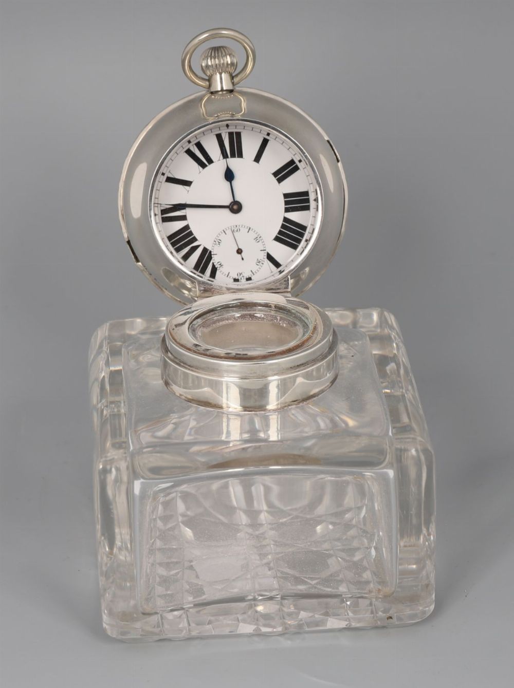 A heavy glass square inkwell with silver mounted hinged cover enclosing a concealed pocket watch with enamel dial. Marked to mount.