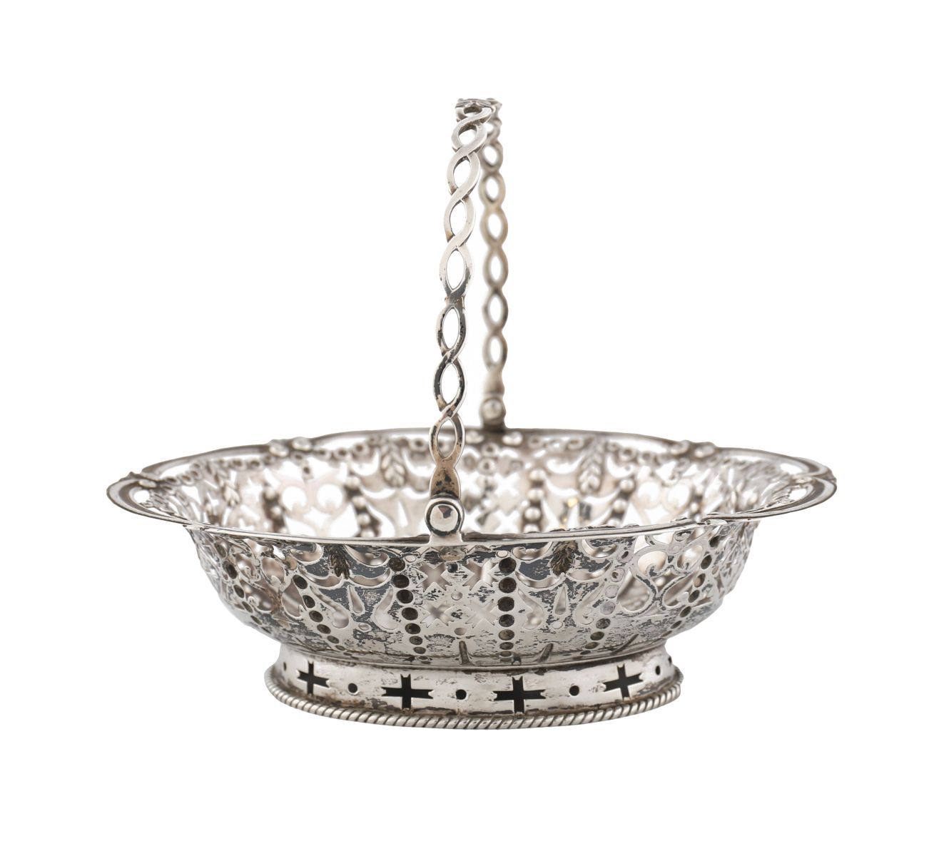 A decorative silver basket of oval form with pierced sides, bead rim and swing handle, the interior gilt. Weight 138 g
