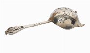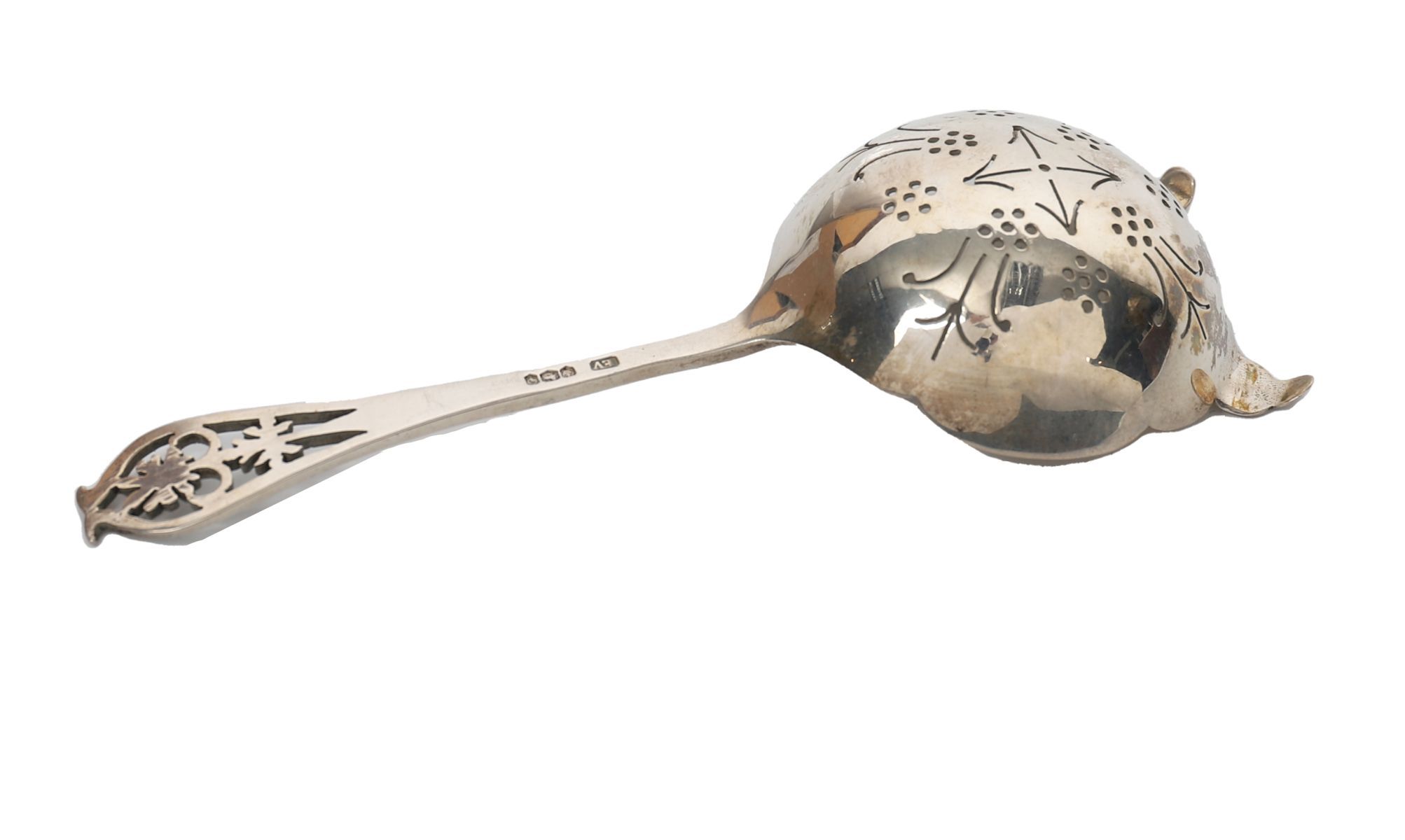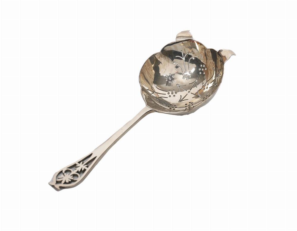 An English silver tea strainer with shaped bowl, pierced with floral and arrow motifs, and openwork handle. Hallmarked.
